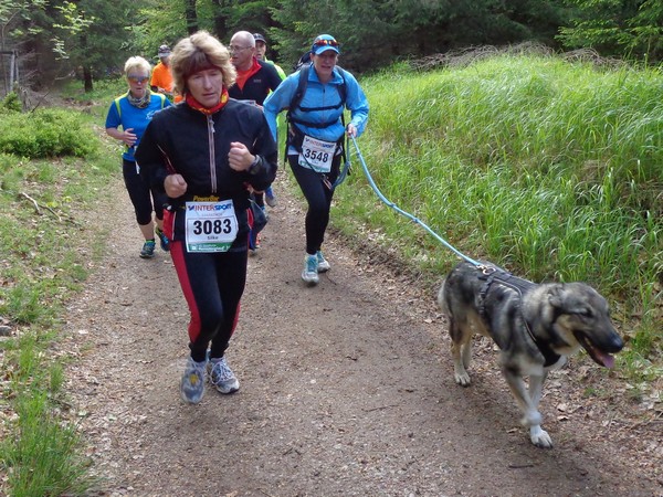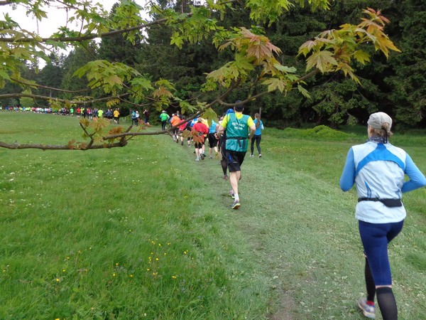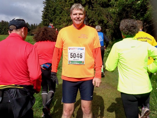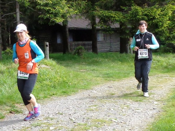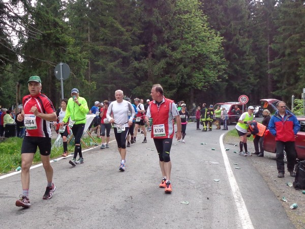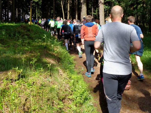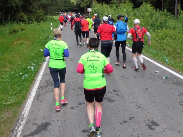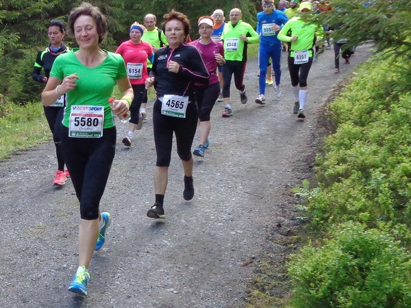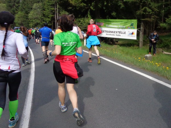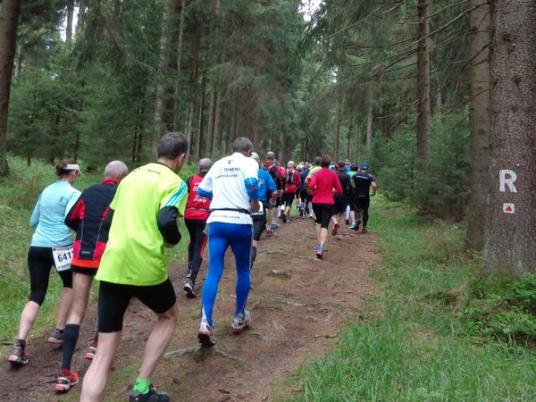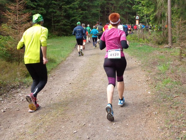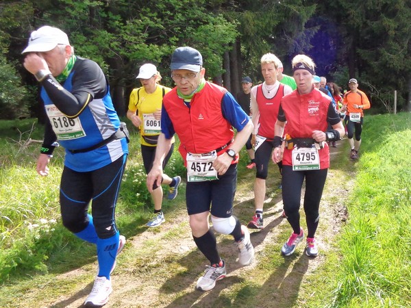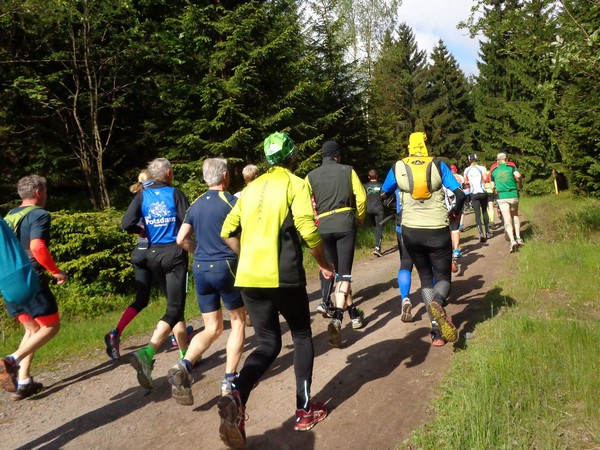 Die Sonne im Rücken geht es nun für weitere 2km mehr oder weniger flach dahin, bevor wir Höhenmeter verlieren. Auf dem schönen Asphalt können wir flott drauflos laufen, links und rechts Wald, in weitem Bogen geht es bergab. Ich mache ein paar Fotos, jetzt sieht sicher jeder noch frisch aus. Von weitem höre ich den Sprecher der ersten Getränkestelle. „Bereits 5,81km habt ihr geschafft, der Rest ist ein Katzensprung!“