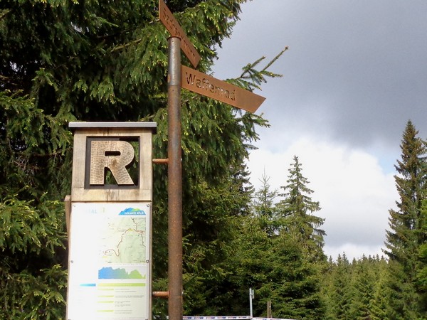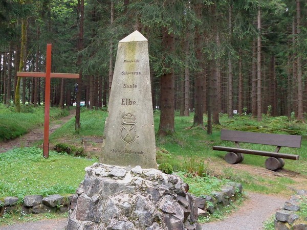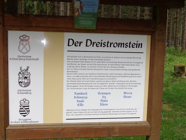 Nach 10km kommen wir zum Dreistromstein. Das ist ein Obelisk, gefertigt aus drei verschiedenen Steinen. Er markiert die Wasserscheiden der Einzugsgebiete von Weser, Rhein und Elbe die letztendlich alle drei in die Nordsee münden.
