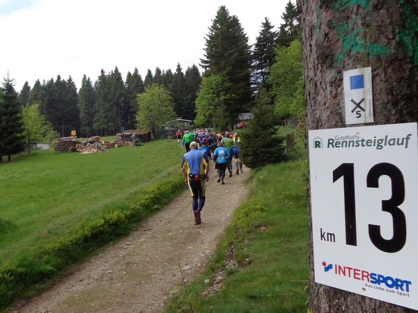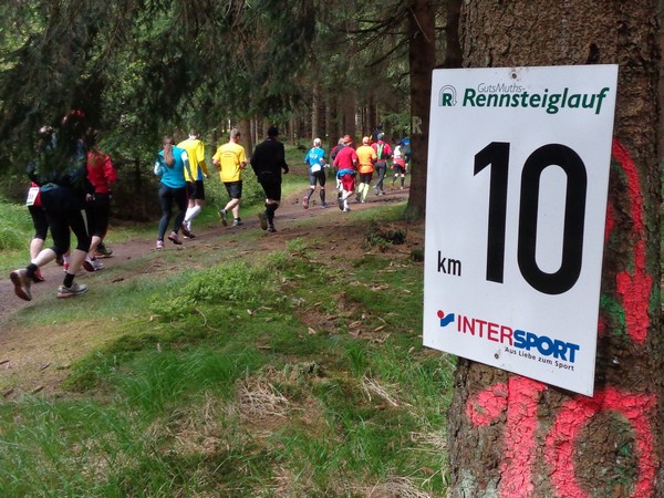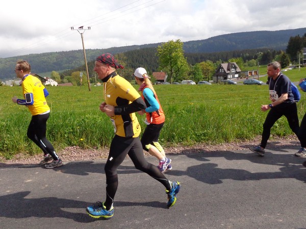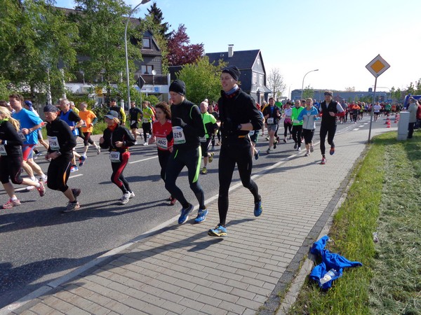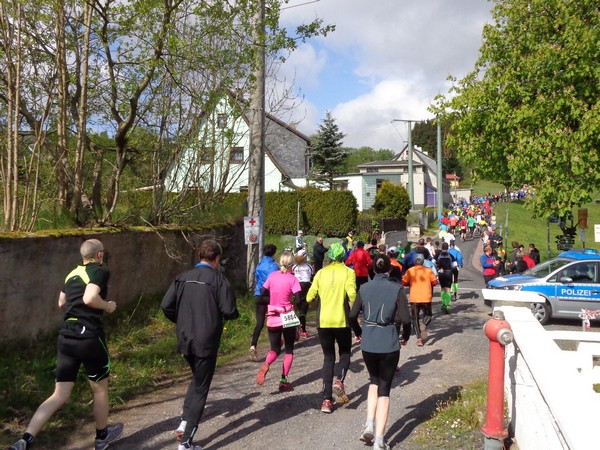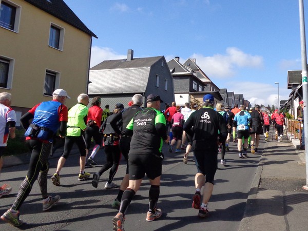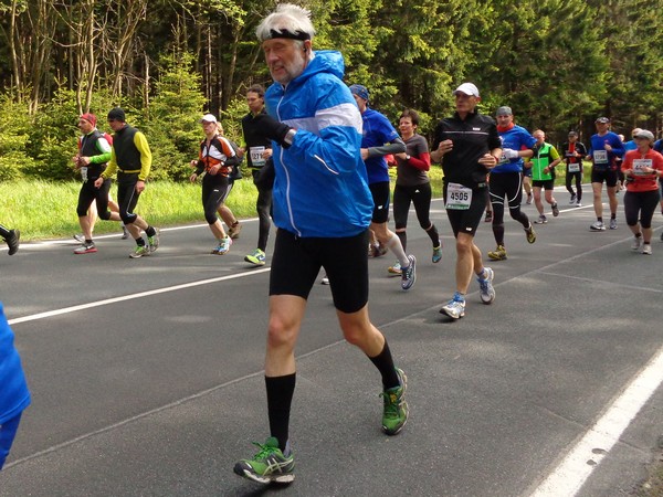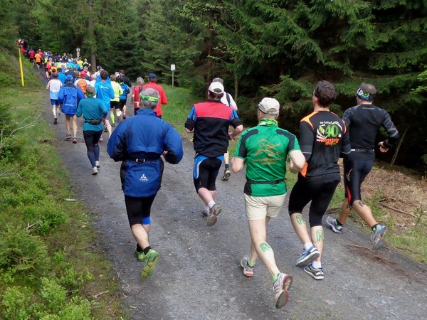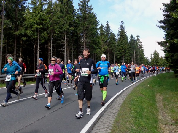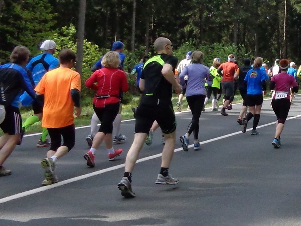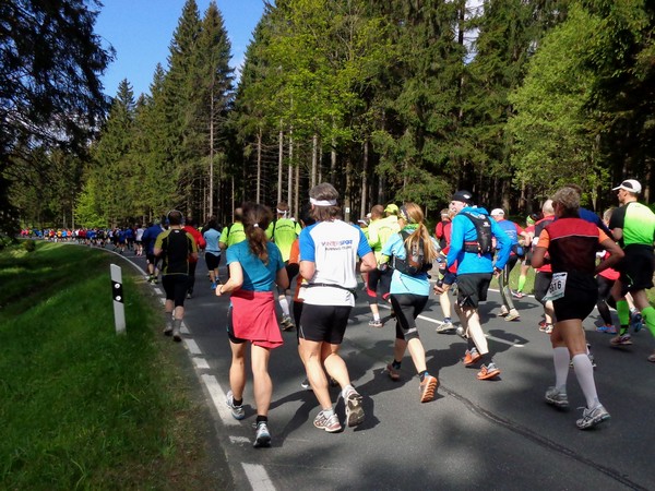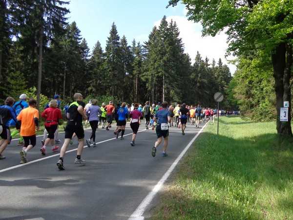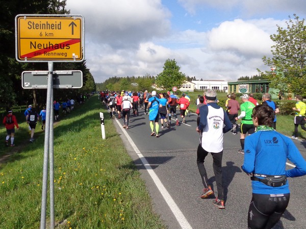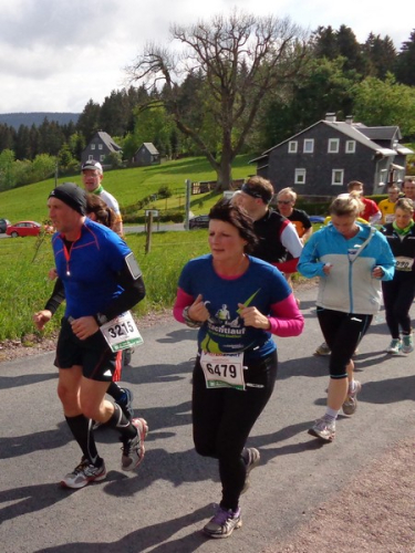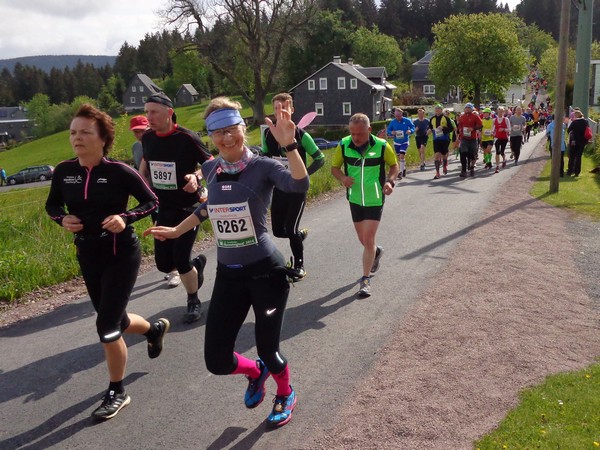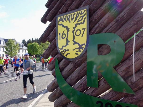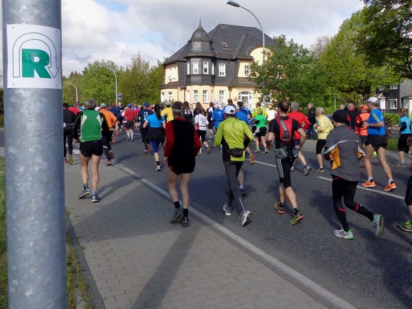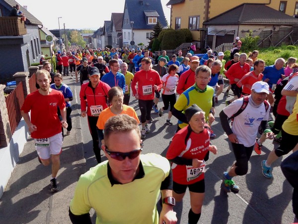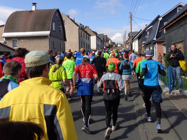 Die Ernst-Thälmann-Straße laufen wir rauf, im Nu haben alle Betriebstemperatur. Teilnehmer am Special Cross stehen Spalier, sie werden 10min nach uns zu einem 3,7km-Lauf starten. Einige interessierte Anwohner feuern uns an, die machen das wohl alle Jahre wieder. Oben wird die Straße breiter, nach knapp 2km haben wir Höhe gewonnen und sind nun raus aus der 7.000-Einwohner-Stadt mit ihren schiefergrauen Häusern und der Glasindustrie. Auf den Straßen hier in der Gegend kommt man immer wieder an Herstellern von gläsernem Christbaumschmuck vorbei.