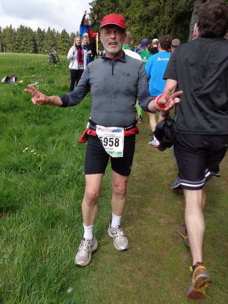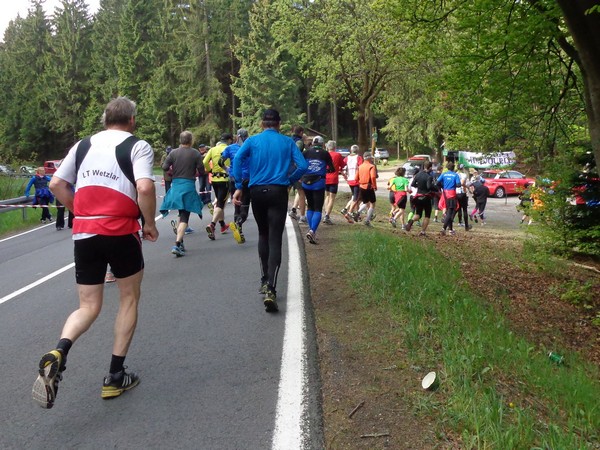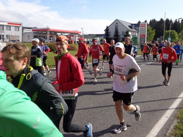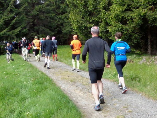 Pünktlich um 9 Uhr knallt die Startpistole. Schon sehe ich die LäuferInnen in breiter Front die Straße hoch laufen, das erste Stück über eine Böschung. Wir da hinten bewegen uns gehend auf die Startlinie zu. Eine Läuferin mit Gehhilfe fällt mir auf, auch dem Sprecher. Wie ich nachher von ihr erfahre, ist das für sie ganz normal und nicht die Folge eines Sturzes etwa. Hugh aus München macht das auch so und der ist richtig schnell damit, also richtig!