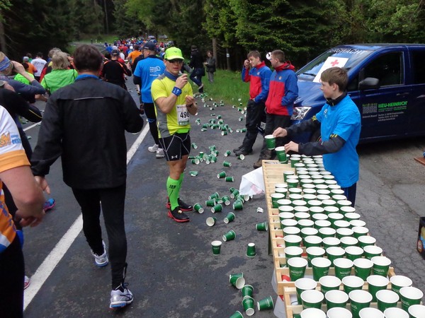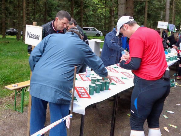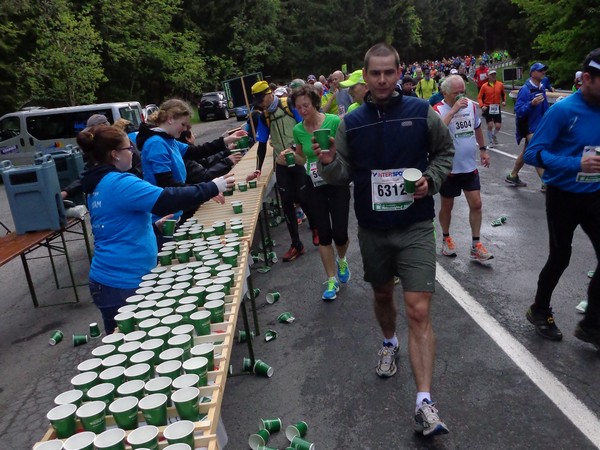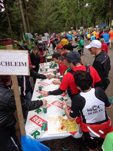 Noch vor km11 gibt es die erste richtige Labestelle. Ich bin gespannt auf den legendären Schleim, der soll Kraft geben, wird im Pappbecher gereicht und muss mich über die Distanz bringen!