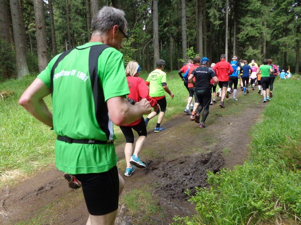 Mit den 5,81km hat der breite Asphalt aber vorerst einmal ein Ende für uns, es geht rechts rein in den Wald, wo die Strecke nicht mehr annähernd so breit ist, doch es geht weiterhin bergab. Ich muss konzentriert laufen und auf den Boden achten, die matschigen Stellen kommen immer wieder unvermutet. Es geht noch eine Weile runter. Wir verlassen den Wald und schon haben wir Zuseher, die uns anfeuern. Nur kurz sind wir in Limbach und nun geht es auch wieder rauf und rein in den Wald, bis hierher bin ich 50min unterwegs.