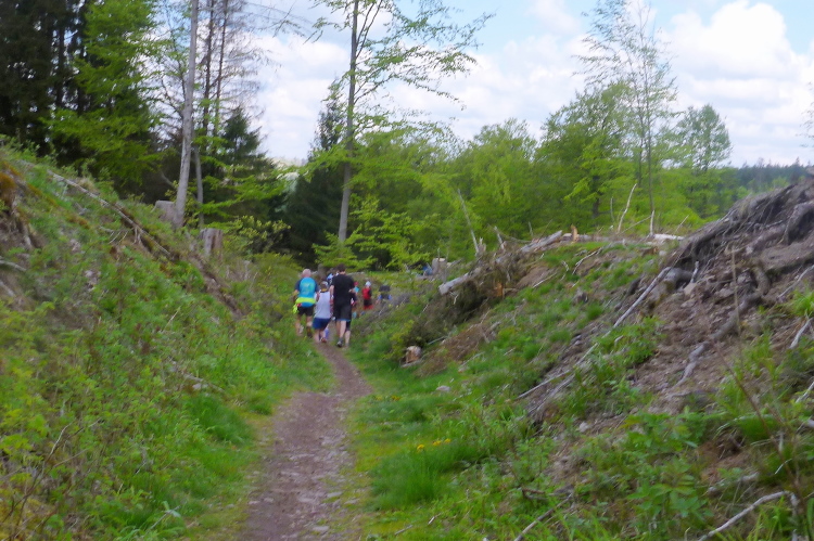 Bei Kilometer 29 verlassen wir Neustadt, der Rennsteig verläuft wieder auf unbefestigten Waldweg, der später kurzzeitig zum Pfad wird. Später im Wald sehe ich dann Hans seinen Vater Gerald anschieben. Gemeinsam geht es leichter und geteiltes Leid ist halbes Leid. Jenseits Kilometer 30 wartet ein Steilstück, wo die Masse marschiert und ich, zwar langsam, aber immerhin noch hochlaufen kann.
