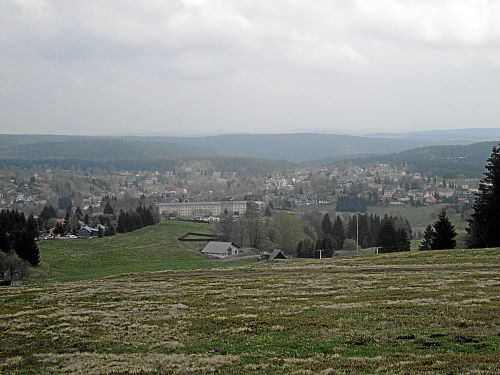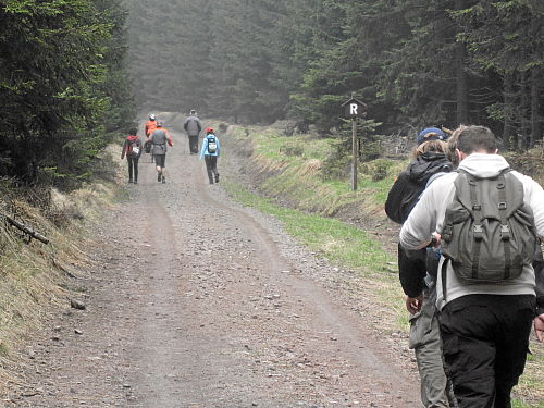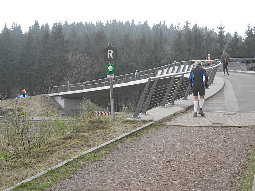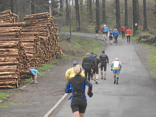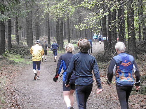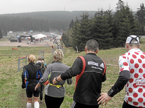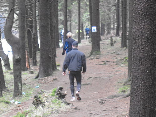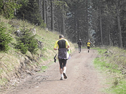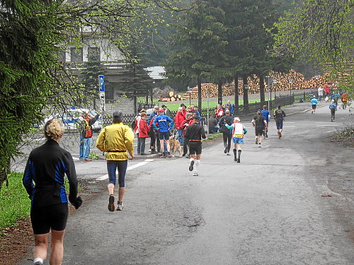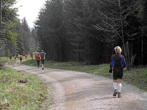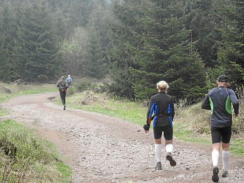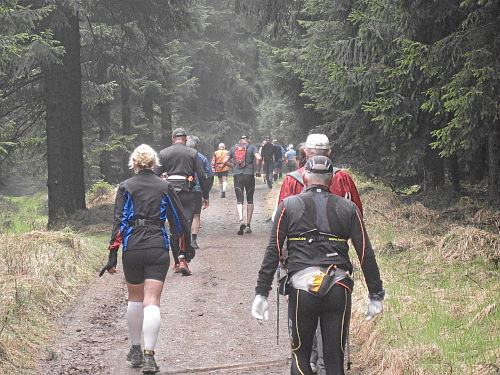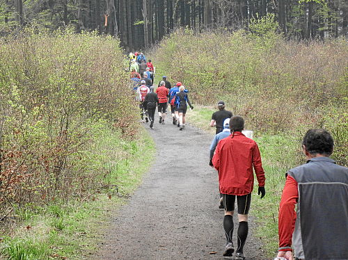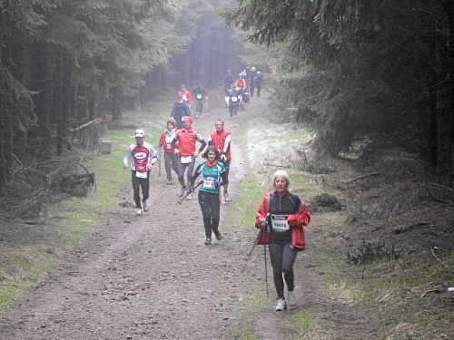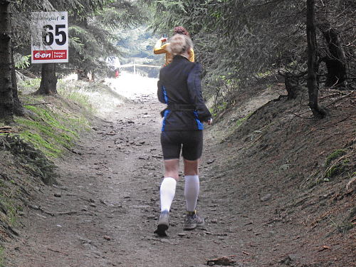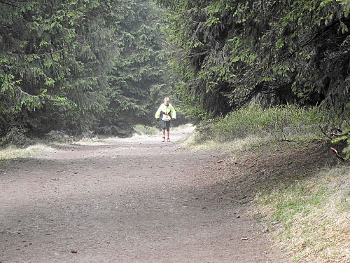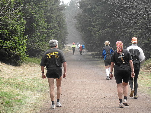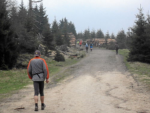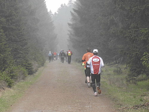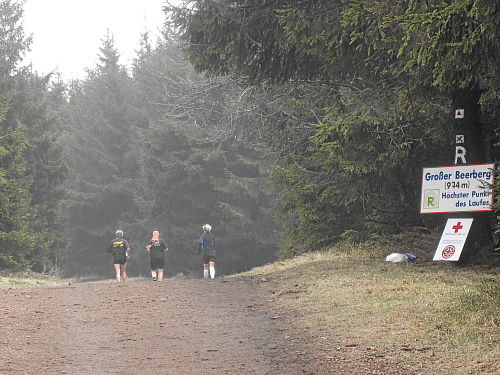 An der Suhler Ausspanne (km 60,2 / 922m) stärkten wir uns noch mal mit Cola und erreichten bei Kilometer 61,8 dann endlich mit "Plänckners Aussicht" (973m) den höchsten Punkt der Strecke. Knapp unterhalb des Gipfels des Großen Beerbergs - 982m, höchster Punkt des Thüringer Waldes - liefen wir vorbei, für eine Aussicht hatte ich aber keine Zeit. Jetzt galt es auf den restlichen 11 Kilometern bis ins Ziel Tempo zu machen, denn sowohl die Zeit, als auch Sigrid drängten. Von meinen 9:30 Stunden Zielzeit hatte ich mich schon längst verabschiedet, auch die 9:43h vom letzten Mal waren illusorisch, jetzt galt es, wenigstens unter 10 Stunden anzukommen.
