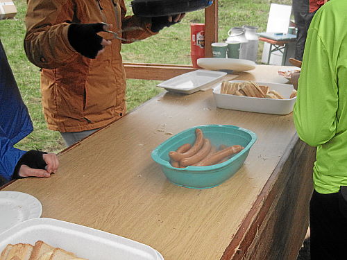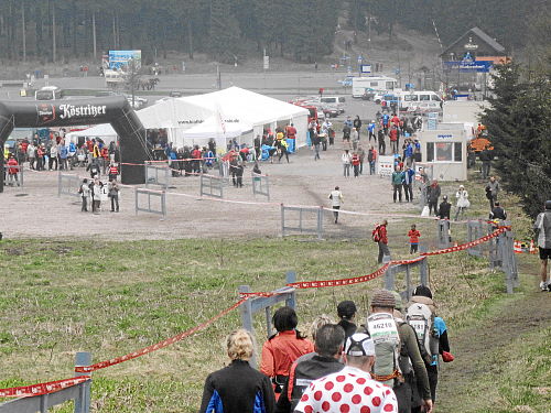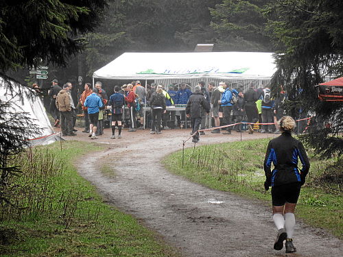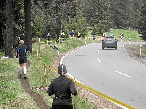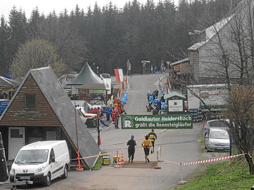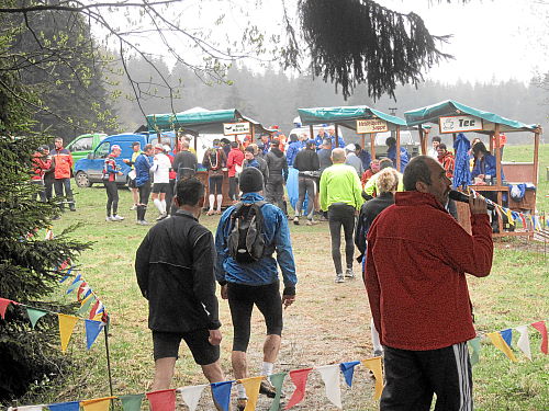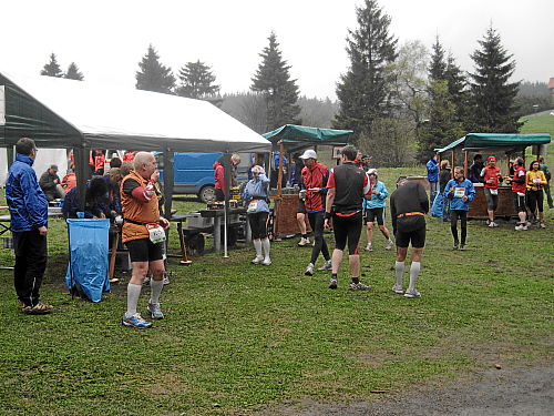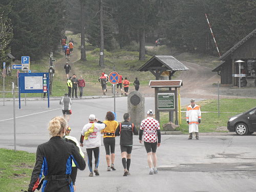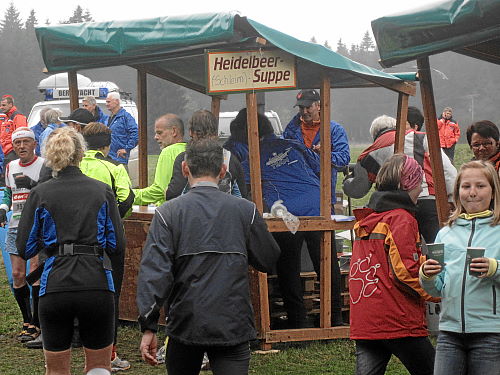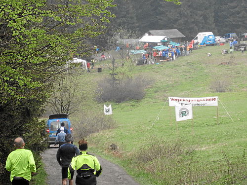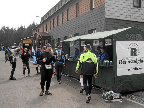 Endlich war der Grenzadler (km 54,7 / 837m) erreicht, eine legendäre Verpflegungsstation! Hier endet die 35-km-Wanderstrecke und auch erschöpfte Läufer können hier aussteigen. Im Gegensatz zu meinen bisherigen Teilnahmen war ich diesmal, dank des Drängens von Angelika, aber in Rekordzeit aus dieser großen Verpflegungsstelle wieder draußen. Lediglich einen Becher Gemüsebrühe, einen mit Haferschleim und einen mit Cola genehmigte ich mir und nach kaum zwei Minuten Aufenthalt war ich wieder auf der Strecke.