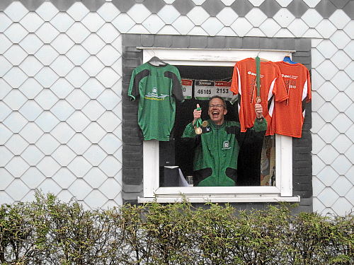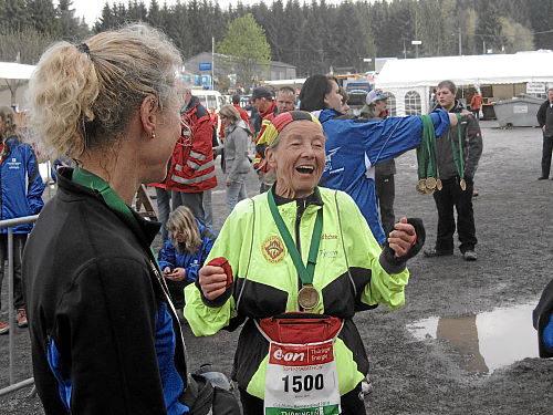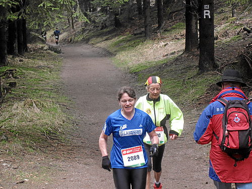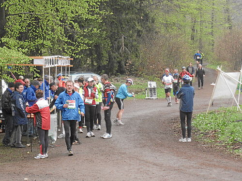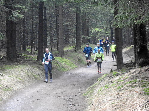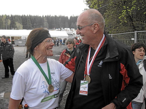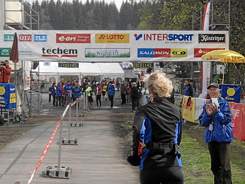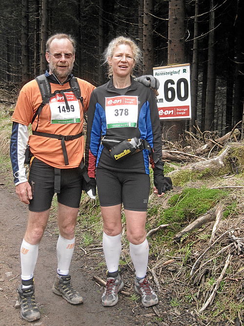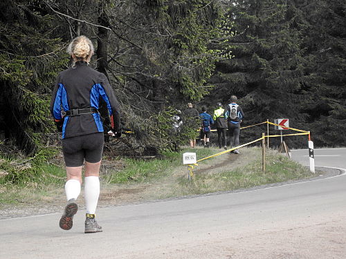 Auch wurden wir ab hier von Sigrid verfolgt. Lag sie bislang stets einige Minuten hinter uns, hatte sie jetzt aufgeschlossen und „blieb dran“. Sigrid Eichner, die Lauflegende, die heute mit der Startnummer 1500 unterwegs war! Vor genau 30 Jahren, im Mai 1981 war sie das erste Mal beim Rennsteiglauf mit dabei. Damals waren das noch keine 72,7 Kilometer, aber etwas mehr als Marathon. Heute, 30 Jahre später, hatte sie ein ganz besonderes Jubiläum, sie lief ihren 1.500sten Lauf über die Marathondistanz oder mehr. Damit ist sie weltweit die Frau mit den meisten Marathon-, bzw. Ultraläufen. Und dass sie mit ihren 70 Jahren noch jede Menge drauf hat, bekamen wir zu spüren, sie hetzte uns sozusagen vor sich her und später, als es dann bergab ging, lief sie auf und davon. „Liebe Sigrid, ganz herzliche Gratulation an dieser Stelle! Wir wünschen Dir, dass Du uns noch bei vielen Läufen vor Dir „hertreiben“ kannst.“