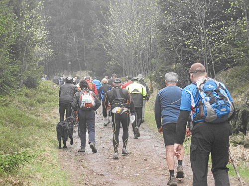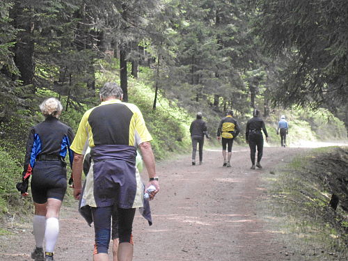 Von km 40 bis 45 ging es wieder nahezu 200 m hoch, aber so moderat, dass wir kaum langsamer wurden. Danach hatten wir eine Art Hochfläche mit weniger Bewaldung erreicht und die nächsten 10 km waren recht leicht zu laufen. Der Weg schlängelte sich ziemlich eben durch die Landschaft, bis auf ein paar Pfützen war auch der Untergrund gut und eigentlich könnte man auf diesem Abschnitt Tempo machen, sofern man noch Reserven hat. Die aber hatten wir nicht genügend und also trotteten wir energiesparend vor uns hin, überholten jede Menge Wanderer und sehnten km 55 herbei.