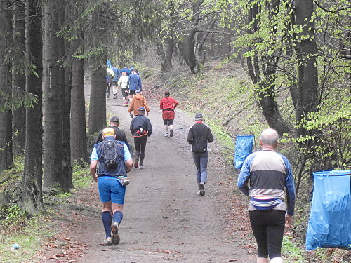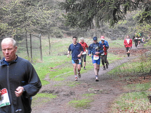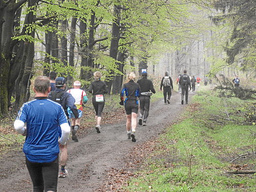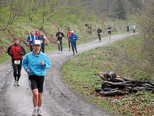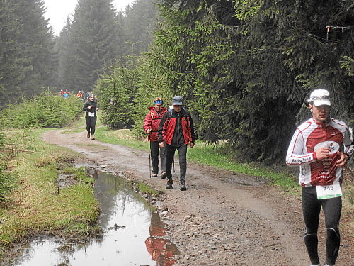 Die nächsten sieben Kilometer hatten es in sich, wie ich mich erinnerte. Immer wieder ging es hoch und runter. Die vielleicht 150 m Höhe bis zur höchsten Stelle des Laufes bei km 62 addierten sich wohl auf 250 Höhenmeter die man überwinden musste. Dazu dieser Untergrund! Das wohl schlechteste Stück Weg traf man hier an: Steine, Wurzeln, große Furchen im Weg, stets irgendwie gewölbt, Pfützen, weicher, matschiger Waldboden, alles war reichlich vorhanden. Entsprechend schlecht war dann auch unsere Zeit auf diesem Abschnitt.