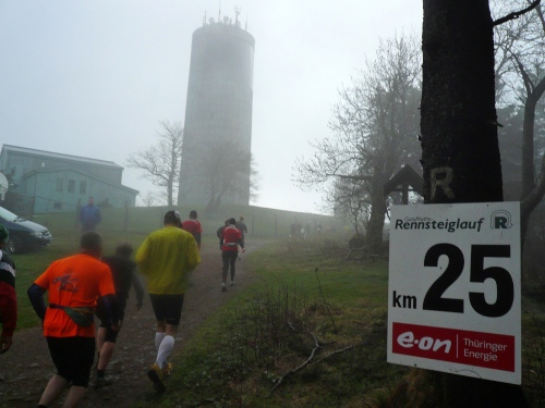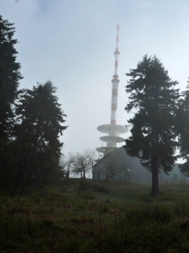 Ein kurzer Abstieg zur Brotteröder Hütte (km 23 / 725 m NN) und dann der große Anstieg über knapp 3 km über den "Oberen Beerberg" ( 841 m) hoch zum Inselsberg (km 25 / 916 m), dessen Türme alsbald durch den Nebel schimmern.