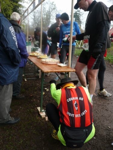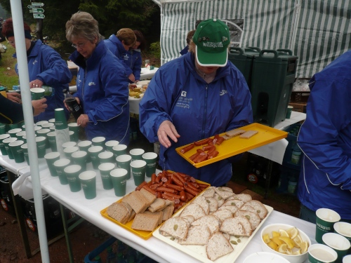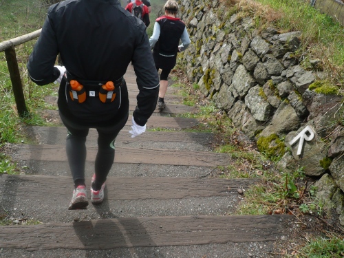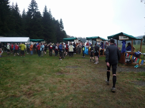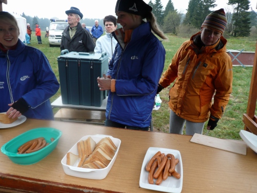 Die nächste Verpflegungsstation ist die Ebertswiese (Km 37,5 / 715 m). Die Hälfte der Strecke geschafft und der kulinarische Höhepunkt erreicht. Ich frage mich, warum Nordicwalker sich um die Würste, Fettbemmen und den Haferschleim drängen müssen und flüchte alsbald zum Anstieg auf den Glasberg (km 38,58 / 760 m).