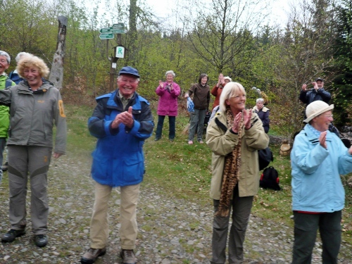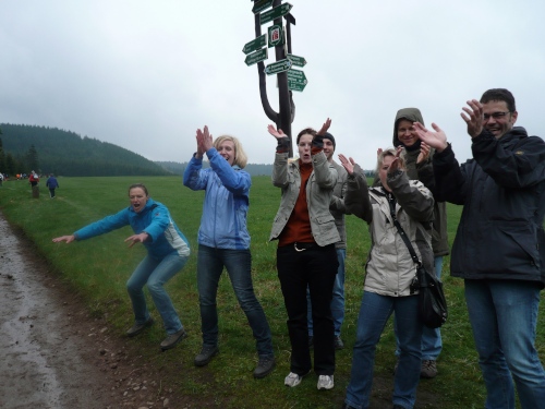 Am Prinz Andreas Platz, den man kurz nach dem Jagdberg erreicht, haben wir bereits eine Strecke von 30 km bewältigt. Mit geringen Höhendifferenzen geht es weiter zum Heuberghaus ( 688 m), auf den Spießberg ( 749 m) zur Getränkestelle dem Possenröder Kreuz (Km 34 / 700 m). Hier kommen die Wanderfreunde der 35 km-Strecke Schnepfenthal - Oberhof mit auf die Strecke und werden uns bis zum Grenzadler bei Oberhof begleiten. Ein kräftiges Ehepaar hat sich „Performance-Team“ auf die Shirts drucken lassen. Ich kann aber nicht wirklich lachen, ich versuche an den Stockträgern vorbeizukommen, das gehört halt zum Rennsteiglauf dazu.