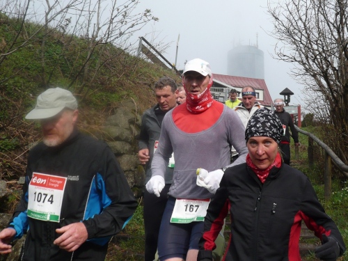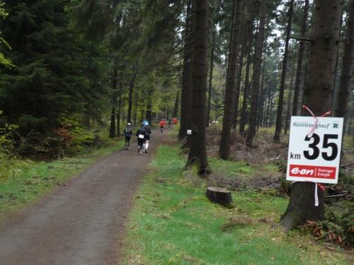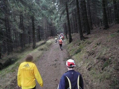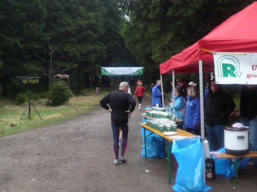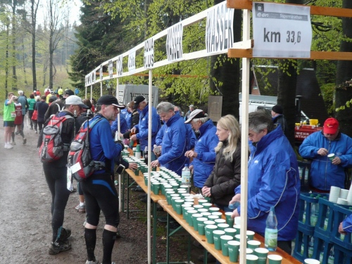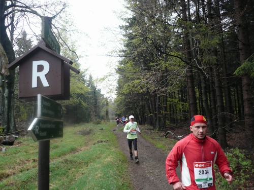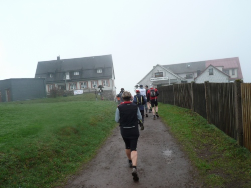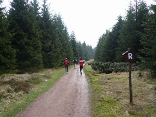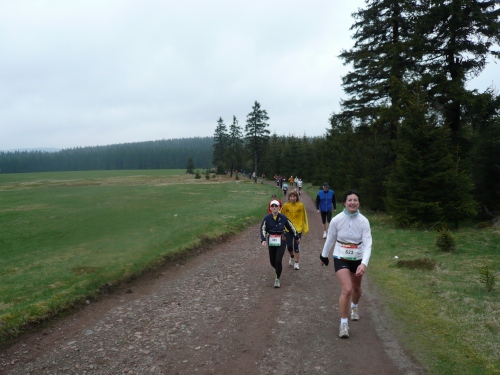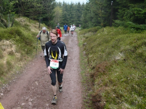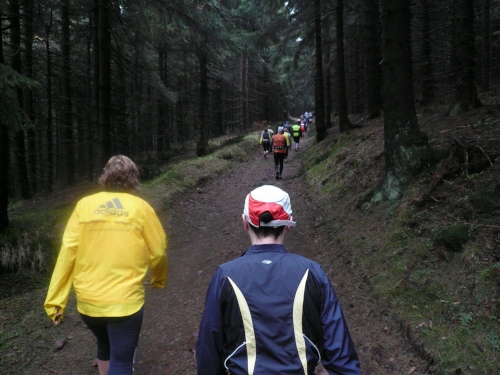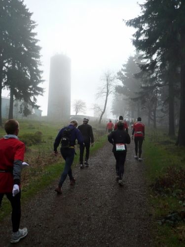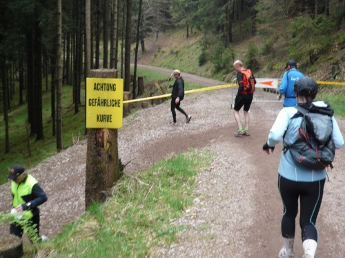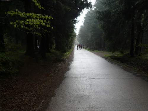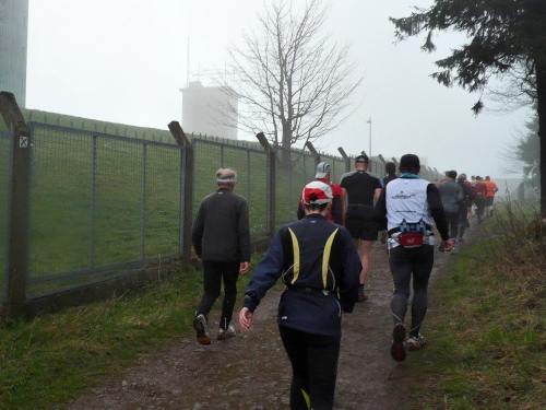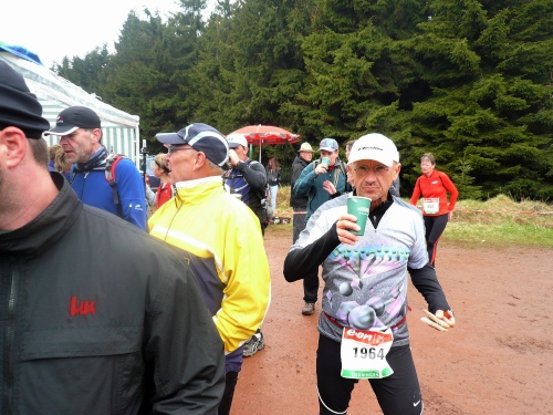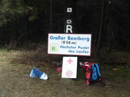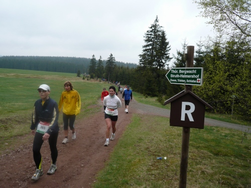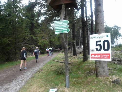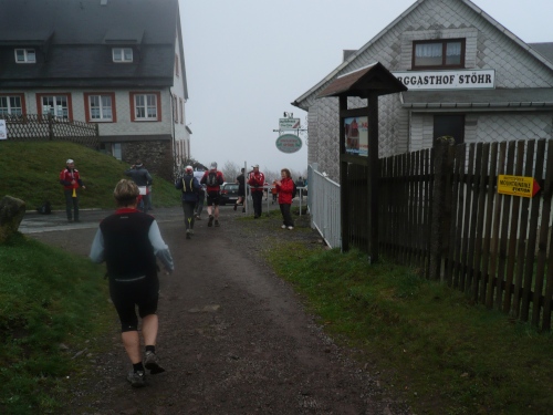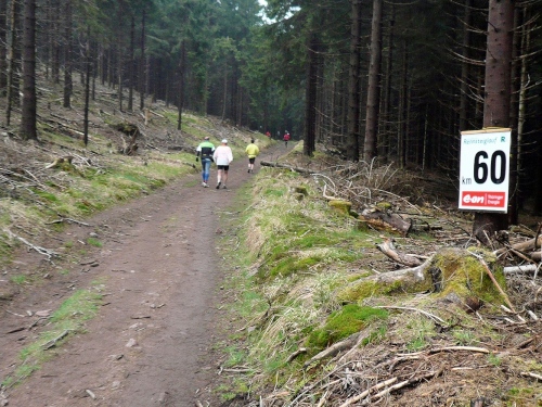 Am Vormittag wurde der Grossteil des nachfolgenden Streckenabschnittes bereits durch die Läufer des Halbmarathons und den 15 km-Wanderern genutzt. Einige der Wanderer sind hier immer noch unterwegs. Für uns alle steht nun aber der Anstieg zum Großen Beerberg, der mit seinen 982 m der höchste Punkt des Thüringer Waldes ist, bevor. Dass ein Vulkan wie der Große Beerberg zur Zeit nicht sehr beliebt ist, ist klar, aber von hier aus (km 62) geht es fast nur noch bergab. An der Wetterstation vorbei zur letzten Verpflegungsstelle "Schmücke" (Km 64 / 916 m).