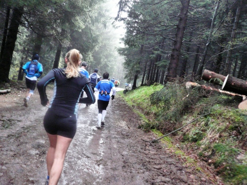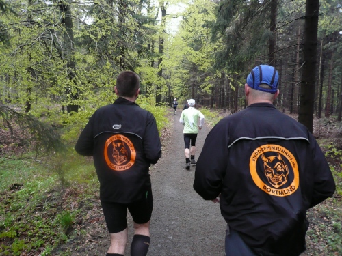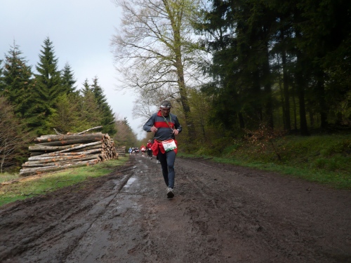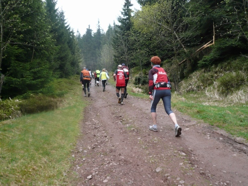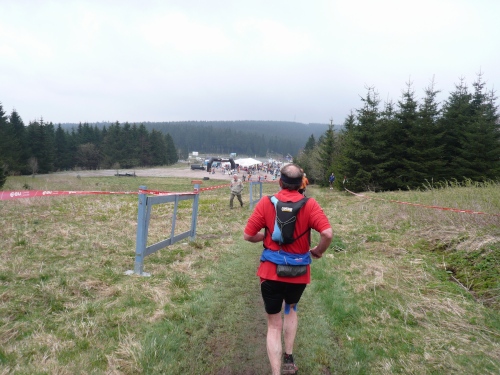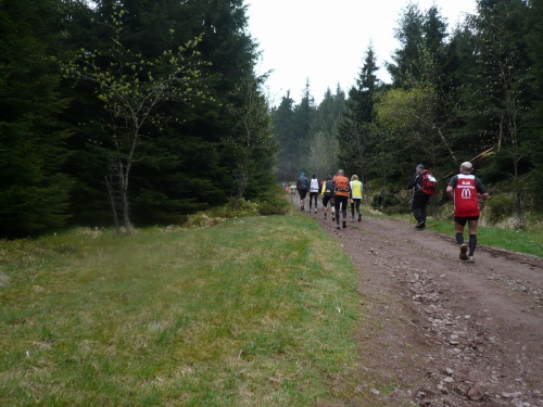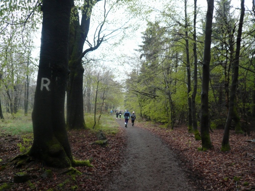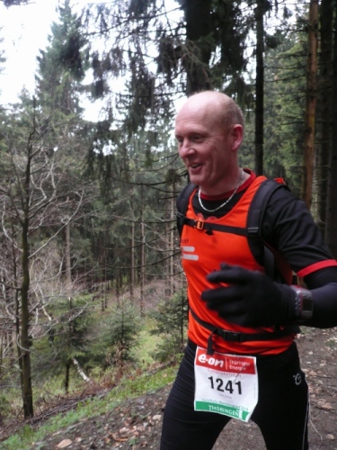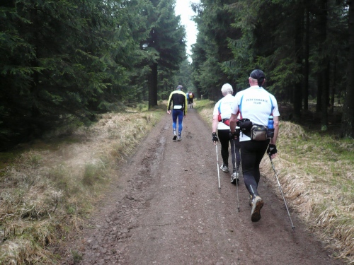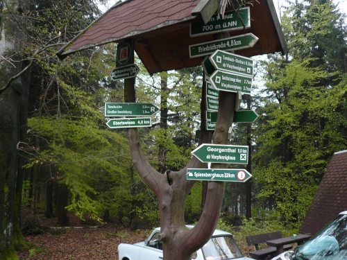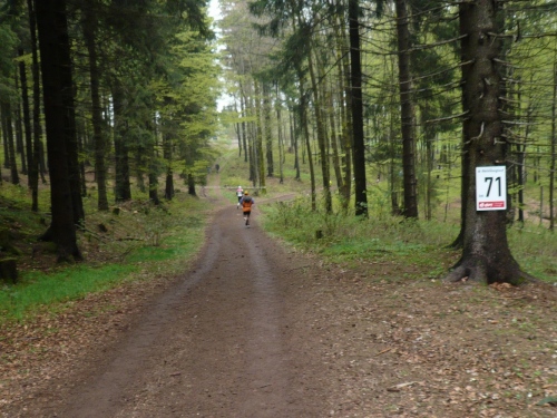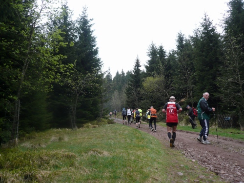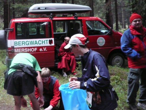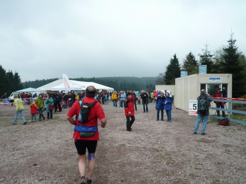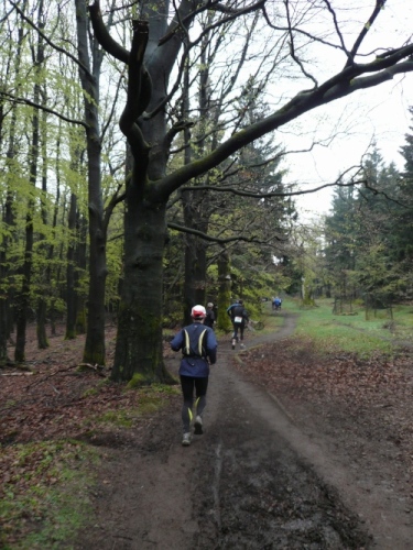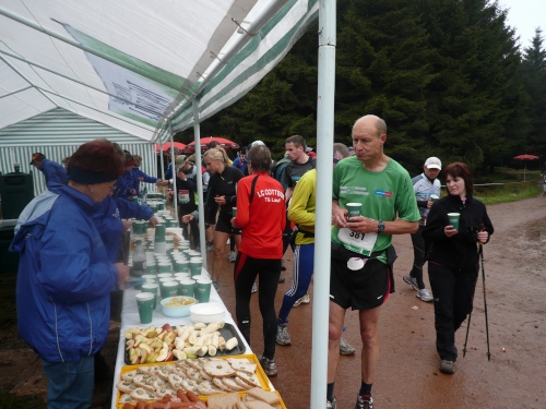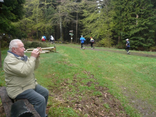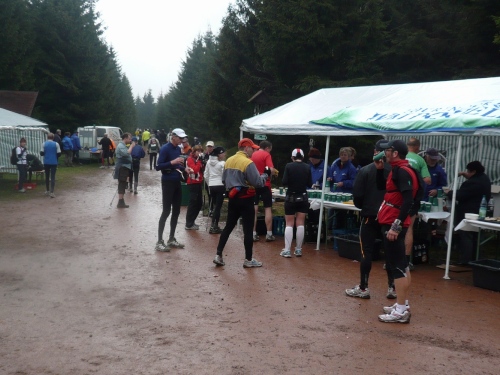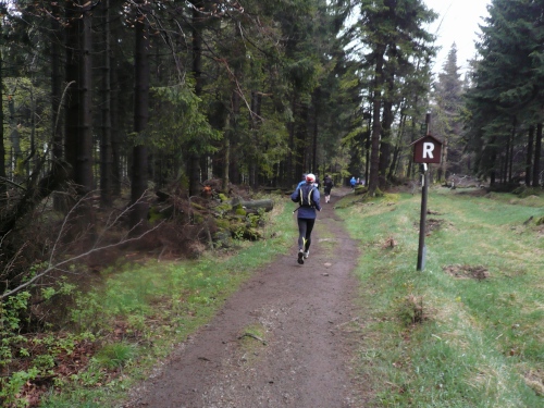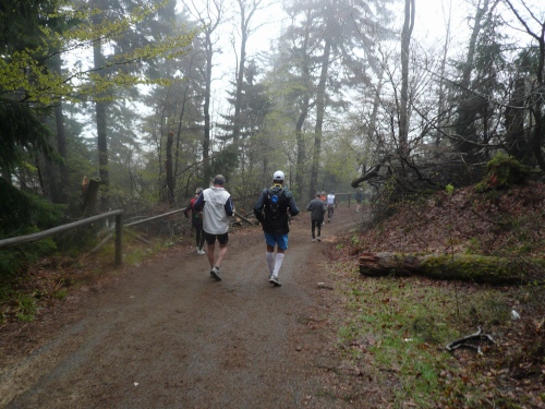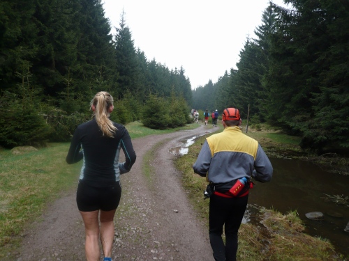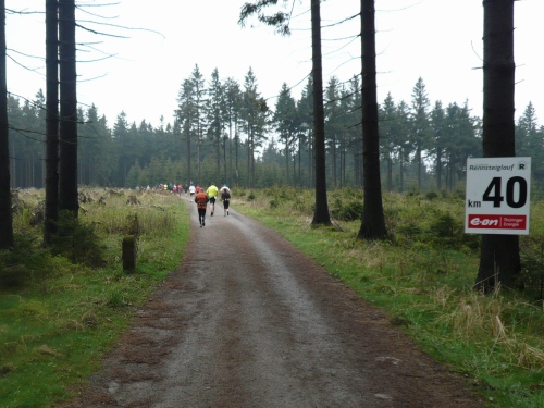 Am Vormittag wurde der Grossteil des nachfolgenden Streckenabschnittes bereits durch die Läufer des Halbmarathons und den 15 km-Wanderern genutzt. Einige der Wanderer sind hier immer noch unterwegs. Für uns alle steht nun aber der Anstieg zum Großen Beerberg, der mit seinen 982 m der höchste Punkt des Thüringer Waldes ist, bevor. Dass ein Vulkan wie der Große Beerberg zur Zeit nicht sehr beliebt ist, ist klar, aber von hier aus (km 62) geht es fast nur noch bergab. An der Wetterstation vorbei zur letzten Verpflegungsstelle "Schmücke" (Km 64 / 916 m).