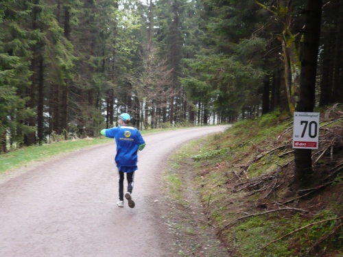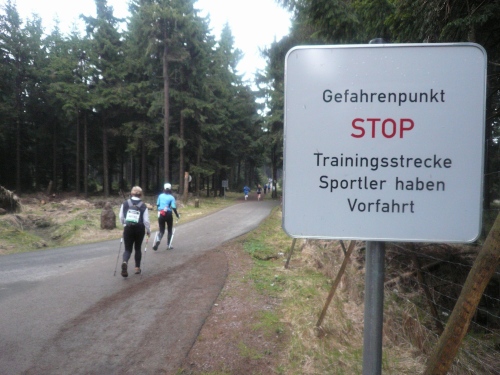 Über die Rollerstrecke, die als Trainingsstrecke für die Skilangläfer dient, ist bei Kilometer 54 der „Grenzadler“ (837 m) bei Oberhof und damit die nächste Verpflegungsstation erreicht. „Gas geben“ ist jetzt angesagt, hier kann man wunderbar laufen.