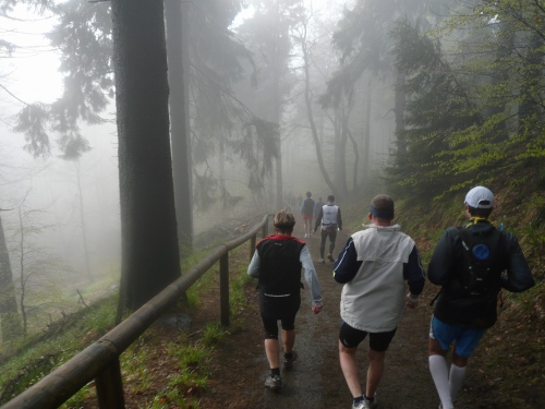 Im Anstieg zur Hirschbalzwiese erreicht man die nächste Getränkestelle Dreiherrenstein, dann ist der Große Weißberg (747 m) bewältigt. Im Gegensatz zu letztem Jahr habe ich keine Eile. Der Rennsteig zeigt sich von seiner urigsten Seite: Sattes Grün, bemooste Bäume und Steine, dazwischen die schwebenden Nebelschwaden und irgendwo hier soll das sagenhafte Schloß im Morast versunken sein.