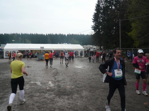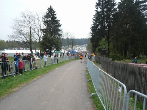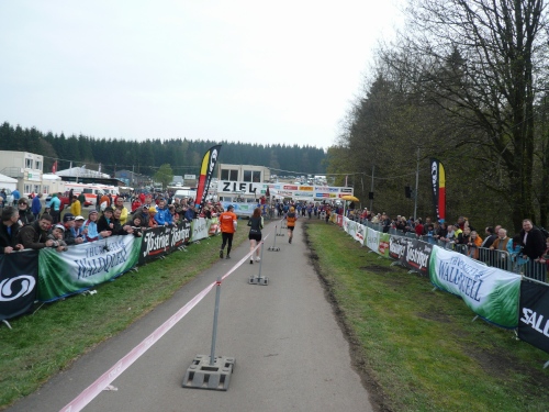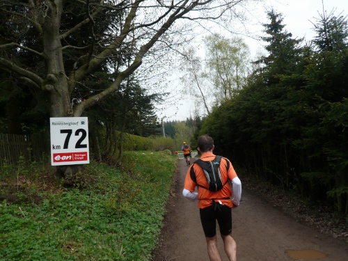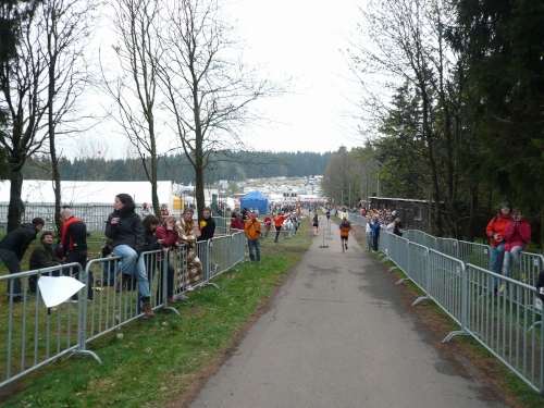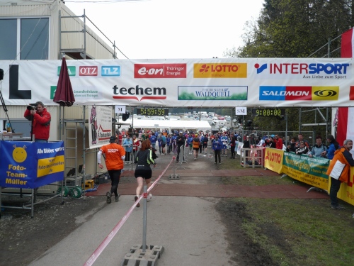 Das Ziel ist nicht mehr weit. Wenn da nicht wieder ein Anstieg die errechnete Zielzeit durchkreuzen würde. Doch dann erblicke ich von der Skipiste aus im Tal die Häuser von Schmiedefeld. Jetzt heisst es Gas geben. Die Kilometerschilder leuchten mir entgegen: 70, 71 und dann endlich 72! Ich kann den Trubel vom Sportplatz hören, und dann öffnet sich der Zielkanal, Beifall, Jubel, der Zielsprecher, Farben, Banner, das Zieltor, viele Menschen und oben der Festplatz und die Campingwiese. Es ist ein grandioser Anblick. 72,7 Kilometer sind geschafft.