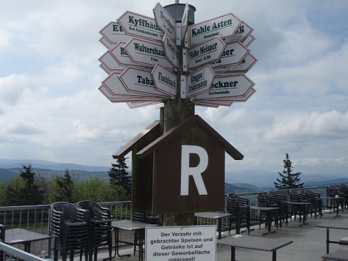 Bei km 24 sind wir dann oben am Inselsberg. Der Inselsberg ist der höchste Berg der nordwestlichen Hälfte des Mittleren Thüringer Waldes und nach dem Großen Beerberg (983 m), dem Schneekopf (978 m) und dem Großen Finsterberg (944 m) der vierthöchste (eigenständige) Berg Thüringens. Als Landmarke ist er von Norden und Westen in einem Umkreis von etwa 30 bis 50 Kilometer, wegen der Türme, gut zu erkennen. Der Berg markiert seit über 1000 Jahren historische Grenzverläufe, denen wir auf dem Rennsteig ab hier recht häufig begegnen, bis hin zum Grenzadler in Oberhof. Die Bergspitze selber ist eigentlich eine Enttäuschung, viel Beton und Technik.