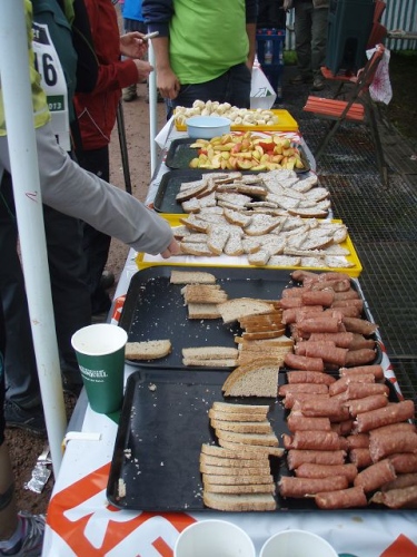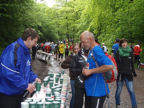 Dann geht es sehr steil direkt wieder runter, zur ersten echten Verpflegungsstelle. Hier gibt’s viel zu essen, auch Griebenschmalzbrote mit Salz, Würste, den berühmten Schleim und ich kann sogar einem Helfer ein Bierchen abschwatzen. Danke. Die Verpflegung ist wirklich toll und soll es auch auf dem Rest der Strecke bleiben. Kurz nach den nächsten Verpflegungsstellen, wo dann auch die Walker und die Marathonis auf die Strecke stoßen, werde ich wieder mal an den Mount Everest Artikel erinnert, diesmal der Müllberge wegen. Aber keine Sorge, das Rennsteigteam macht alles weg, und einige Spaziergänger mit denen ich spreche sagen sogar, dass der Rennsteig nach dem Lauf immer viel sauberer ist als vorher. Also nochmals Dank an die vielen Helfer. Als Organisator des Röntgenlaufes kann ich sehr gut nachempfinden wie viel Aufwand das wirklich ist, besonders wenn wie hier noch viel mehr Läufer am Start sind.