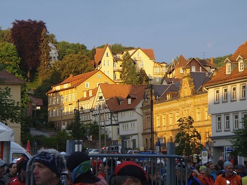 Da ich Bilder machen will, lasse ich mir Zeit und stelle mich ganz hinten an, was bei Chipmessung ja kein Problem darstellt. Es geht kurz durch die malerische Innenstadt mit den tollen Fachwerkgebäuden und teilweise Jugendstilfassaden, um dann nach dem Stadttor direkt den Berg hinauf zu gehen. Gehen kann man hier wörtlich nehmen. Ein freundlicher Hinweis ist das „Ortsausgangsschild“ Eisenach Ende – Schmiedefeld 72 km. Nach dem Schild geht es dann mal mehr, mal weniger gut 25 km bergan, bis man oben am Rennsteig ist und diesen dann nicht mehr verlässt.