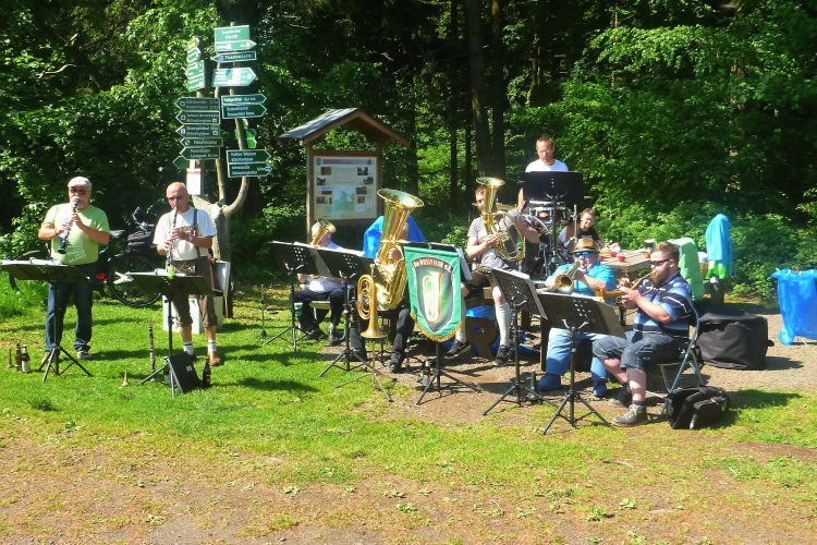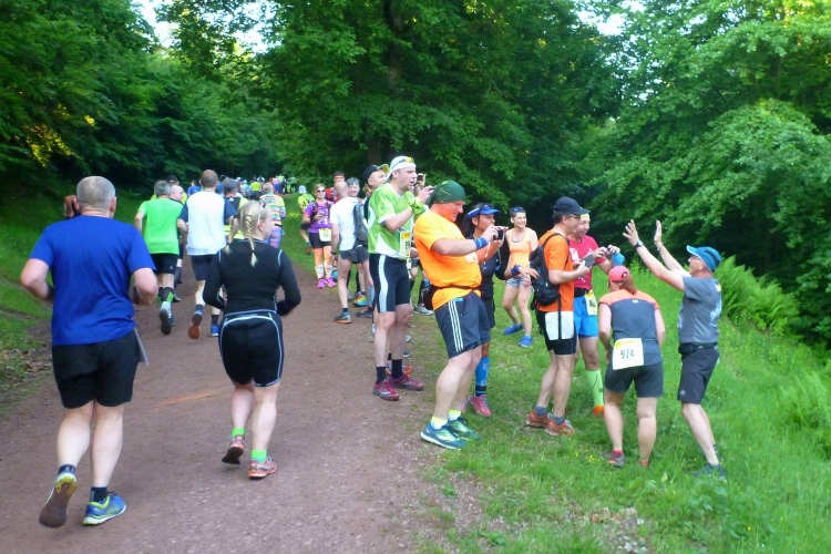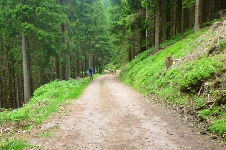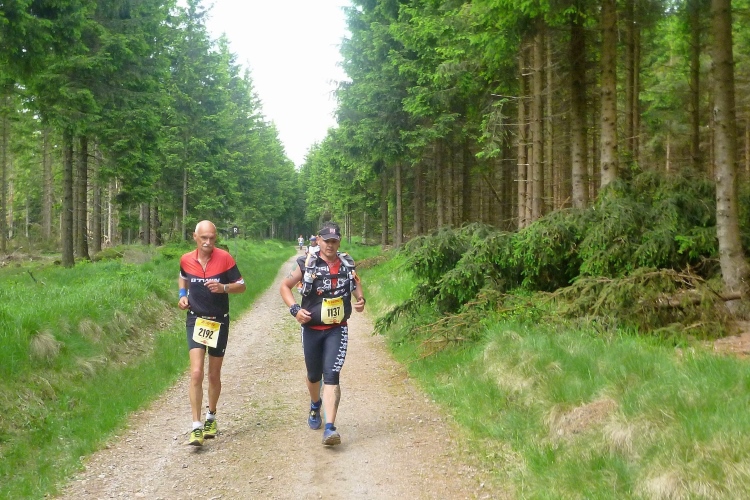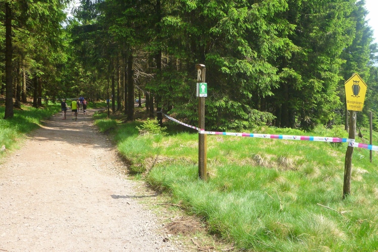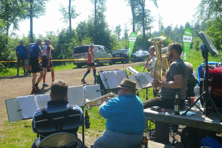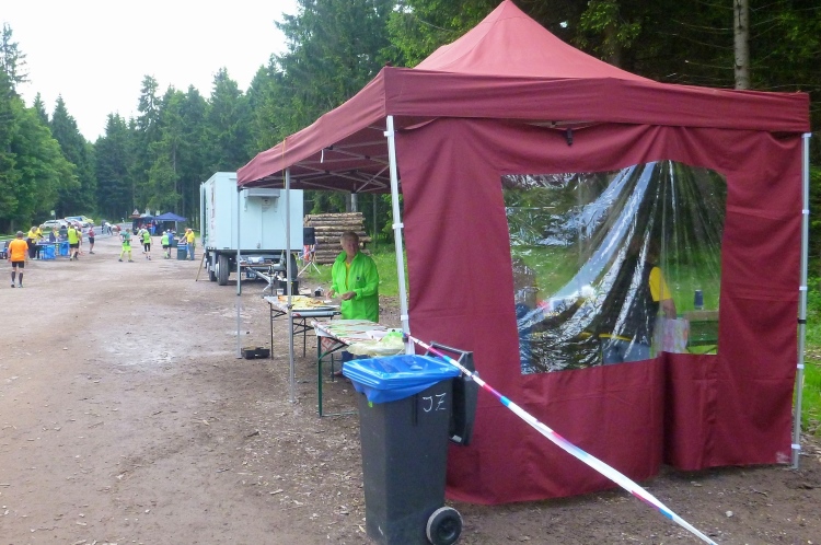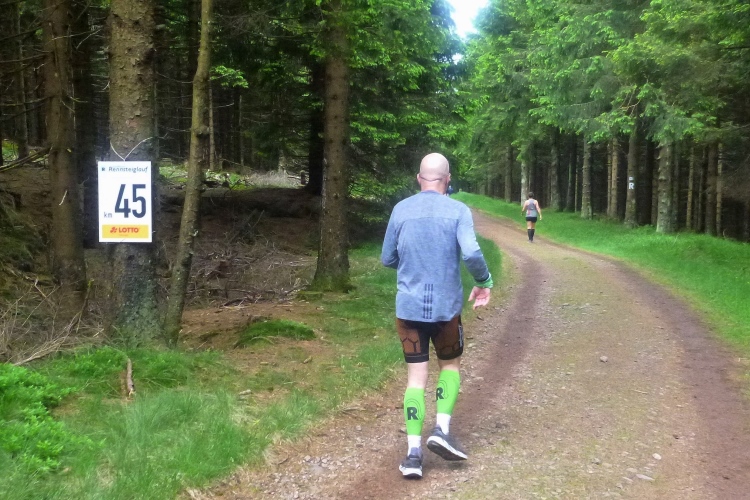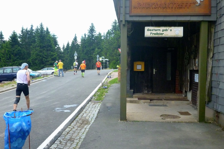 Bis km 41 dann wieder Wald, Wald, Wald. Wobei der Läufer ja sowieso meist auf den Boden sieht. Aufgelockert wird die Monotonie durch die Verpflegungsstände. Die Lauf- und Wanderfreude Seligenthal haben sogar eine Musikkapelle engagiert. Da verweilt man gerne etwas länger. Vier Kilometer weiter dann die Ebertwiese. Wir werden namentlich begrüßt, auch die Anzahl der Teilnahmen wird bekanntgegeben, für Judith und mich ja 2. Interessanter sind für mich die warmen Wiener Würstchen, die sich zu den belegten Broten, die es auch schon vorher gab, hinzugesellen. Ich greife zu. Mal sehen, wie mir diese ungewohnte Laufverpflegung bekommt. An die VP-Stellen schließen sich sogenannte Umweltzonen an: Müllsäcke stehen bereit und man sollte seinen Becher spätestens vor der letzten Fahne in einen Sack geworfen haben. Hier ist es noch besser: Die Anzahl der Abfallsäcke wird herunter gezählt, der letzte hat die Nummer 1. Damit will man verhindern, dass die Pappbecher auf dem halben Rennsteig verteilt den nächsten Jahren entgegensehen.