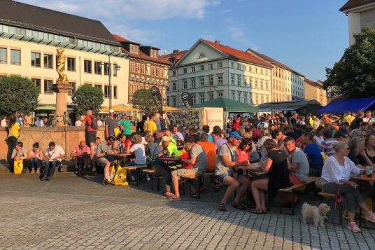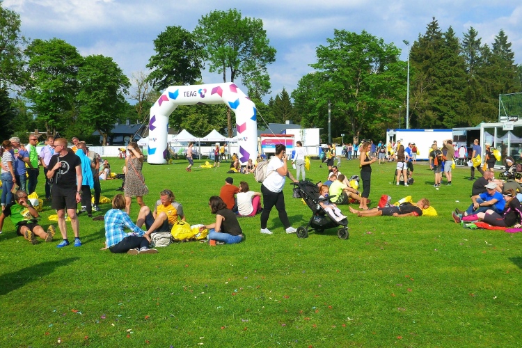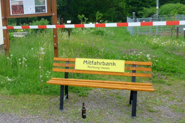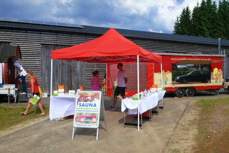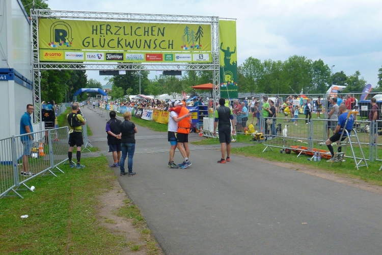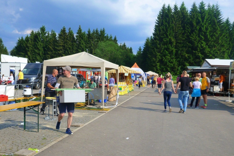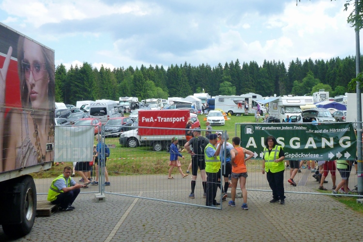 Weiter zur Taschenabholung auf der Wiese nebenan. Oberhalb stehen unzählige Wohnmobile und –wagen der Teilnehmer. Wer gerne feiert, sollte sich ein Quartier in Schmiedefeld organisieren. Hier findet heute die wahrscheinlich ausgelassenste After-Finish-Party der Welt statt.