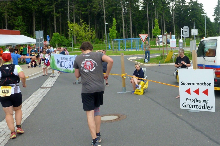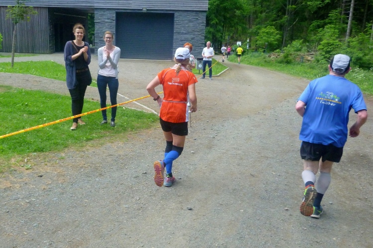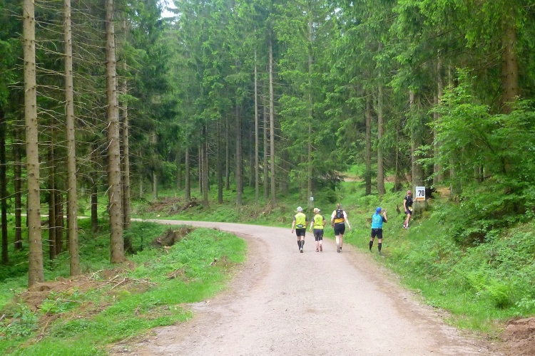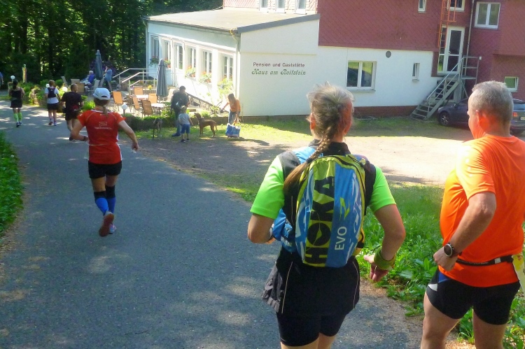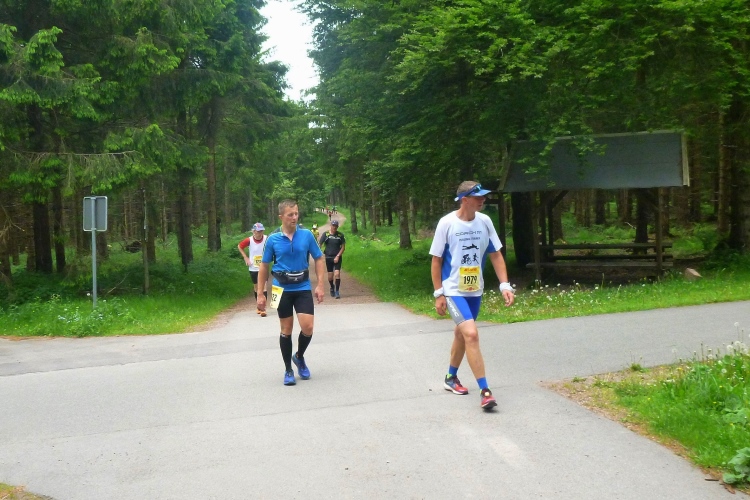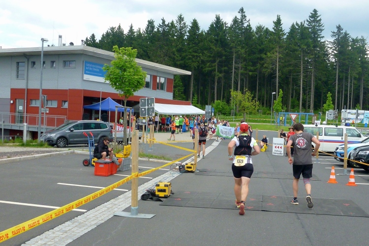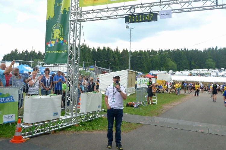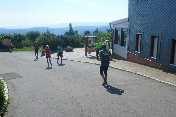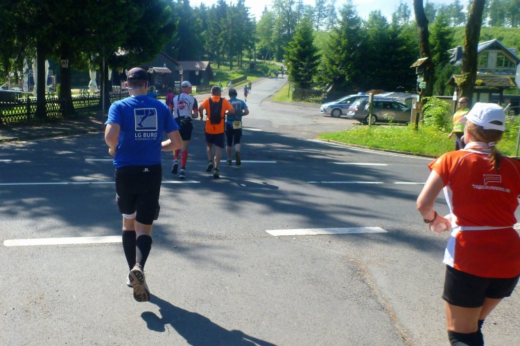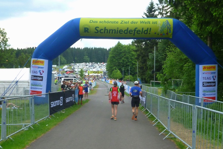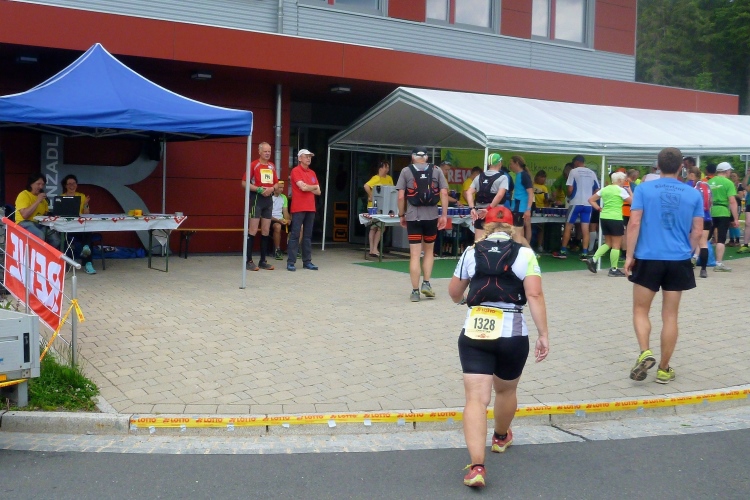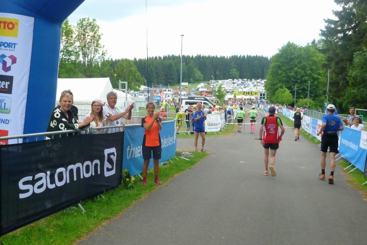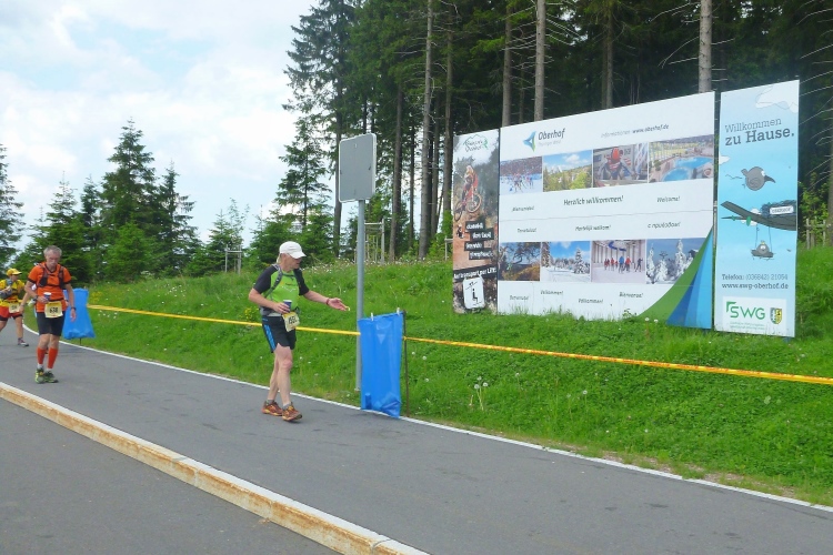 Als erstmaliger Teilnehmer bin ich überrascht, wie schnell wir hier noch unterwegs sind. Meine Schätzung, dass wir in 10:40 h das Ziel erreichen, reduziert sich auf den letzten Kilometern immer mehr und am Ende werden es 10:08 h. Das 70-km-Schild macht schon richtig stolz. So lang war ich noch nie zu Fuß unterwegs. Eine Skipiste ist zu queren. Über einen schmalen Weg geht es nach Schmiedefeld. Die Party kann man schon hören. Eine Kuppe und dann noch dreihundert Meter auf das Ziel zu. Auf der linken Spur laufen die Marathonis ein.
