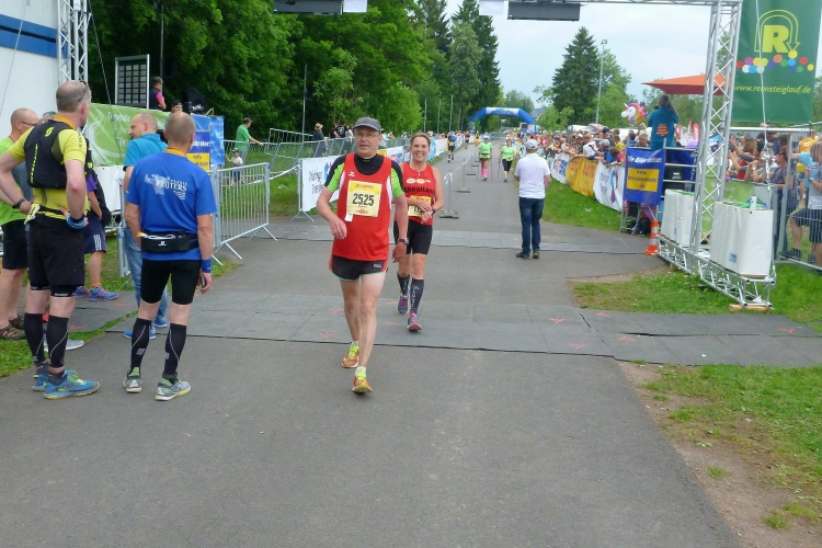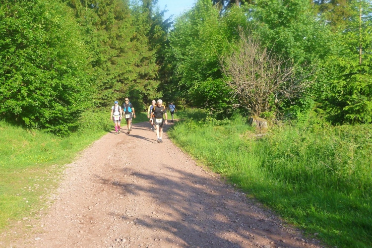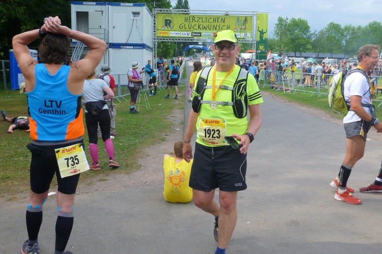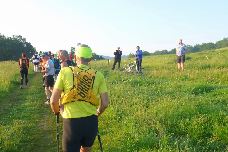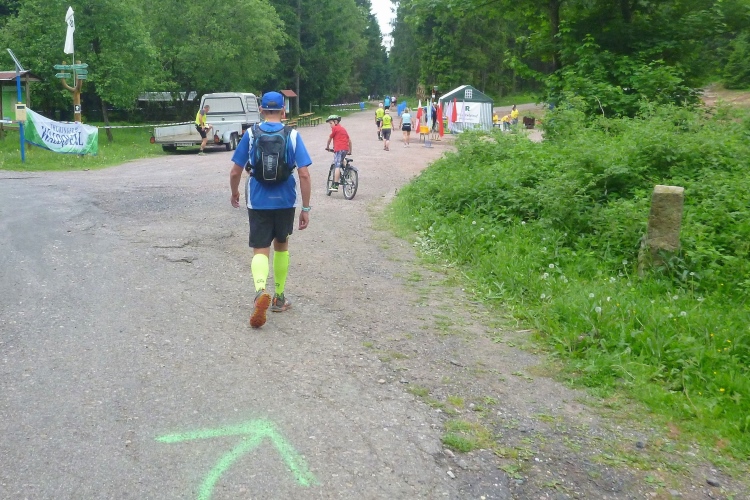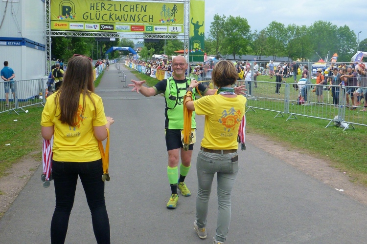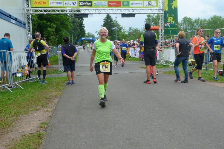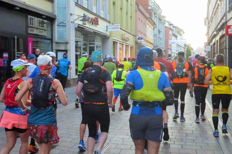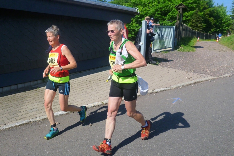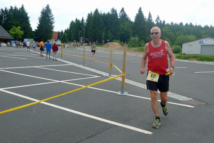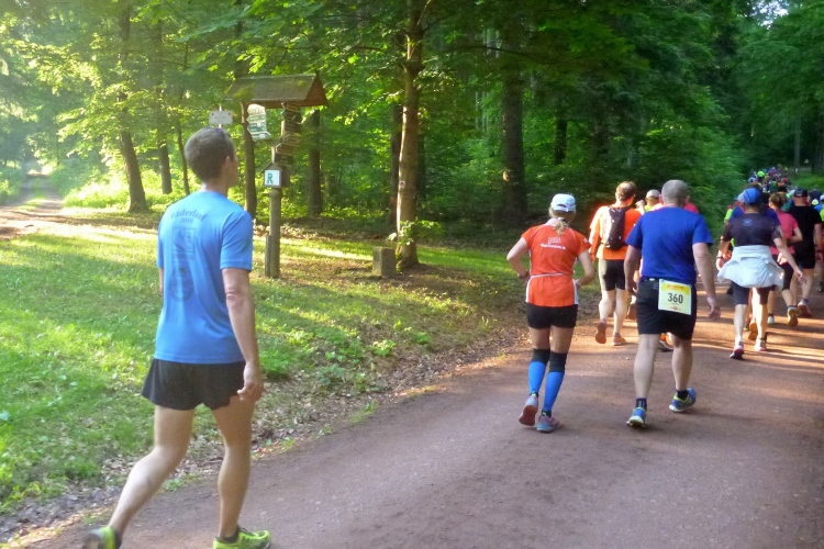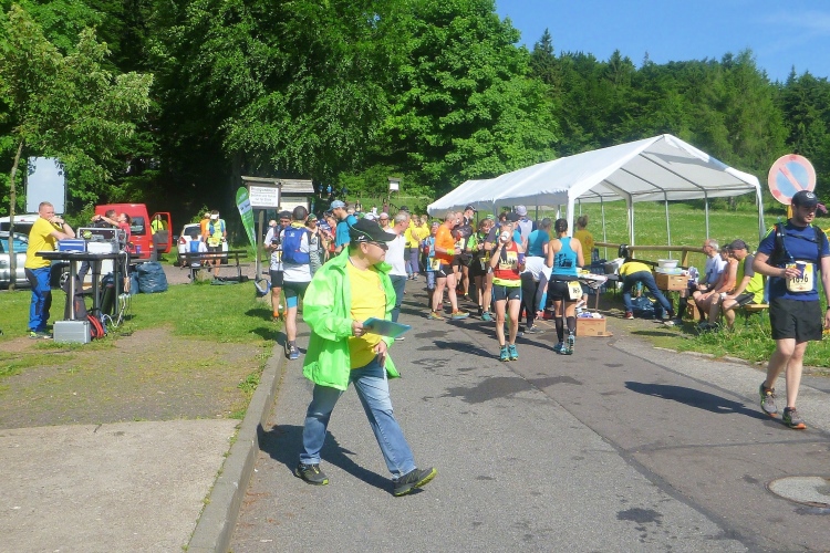 Als erstmaliger Teilnehmer bin ich überrascht, wie schnell wir hier noch unterwegs sind. Meine Schätzung, dass wir in 10:40 h das Ziel erreichen, reduziert sich auf den letzten Kilometern immer mehr und am Ende werden es 10:08 h. Das 70-km-Schild macht schon richtig stolz. So lang war ich noch nie zu Fuß unterwegs. Eine Skipiste ist zu queren. Über einen schmalen Weg geht es nach Schmiedefeld. Die Party kann man schon hören. Eine Kuppe und dann noch dreihundert Meter auf das Ziel zu. Auf der linken Spur laufen die Marathonis ein.