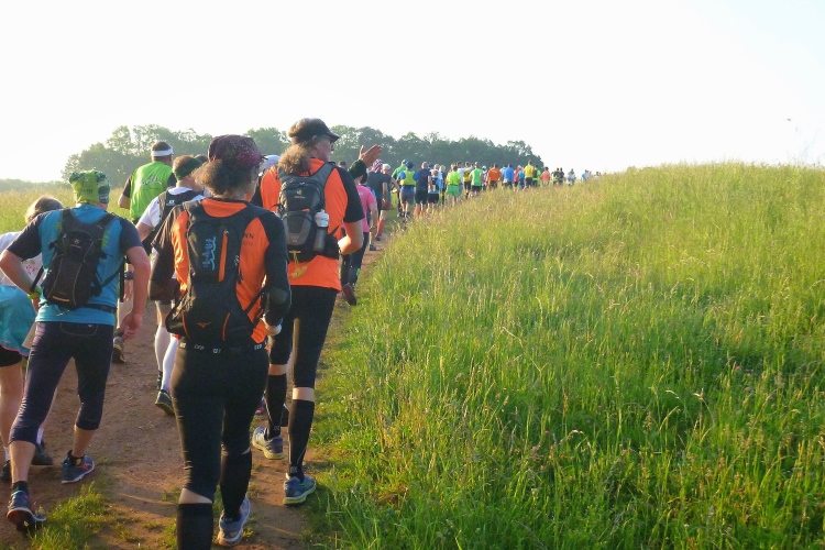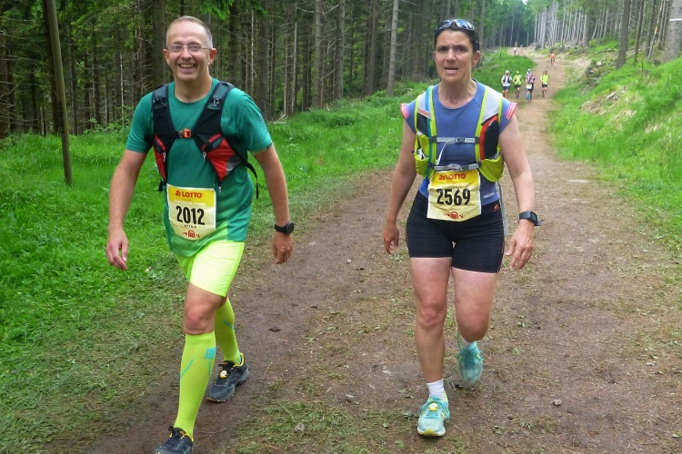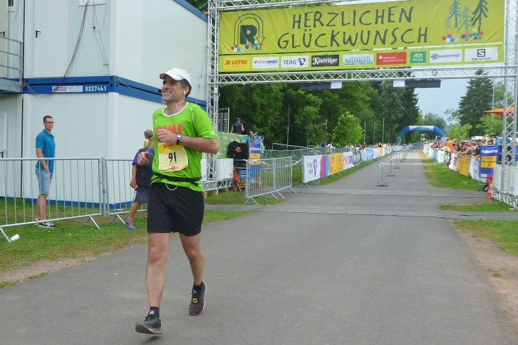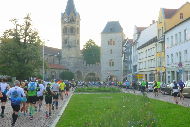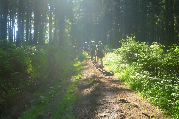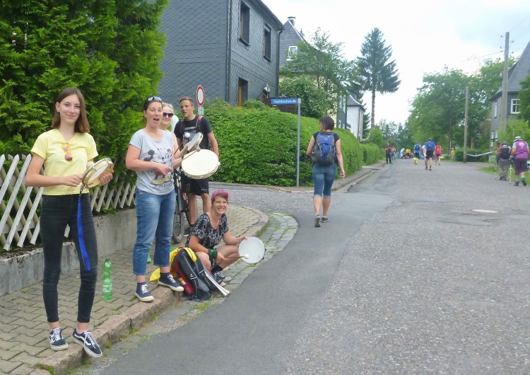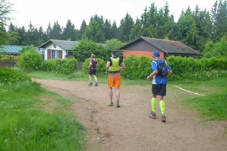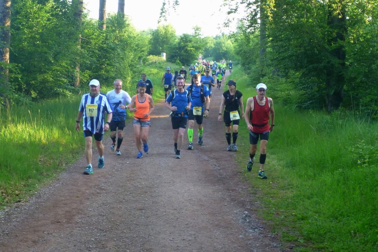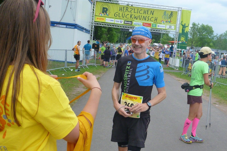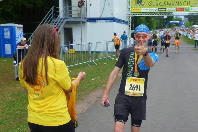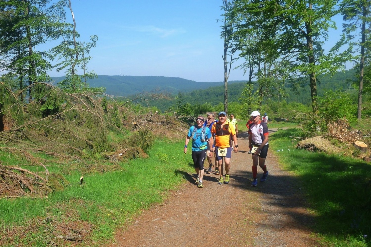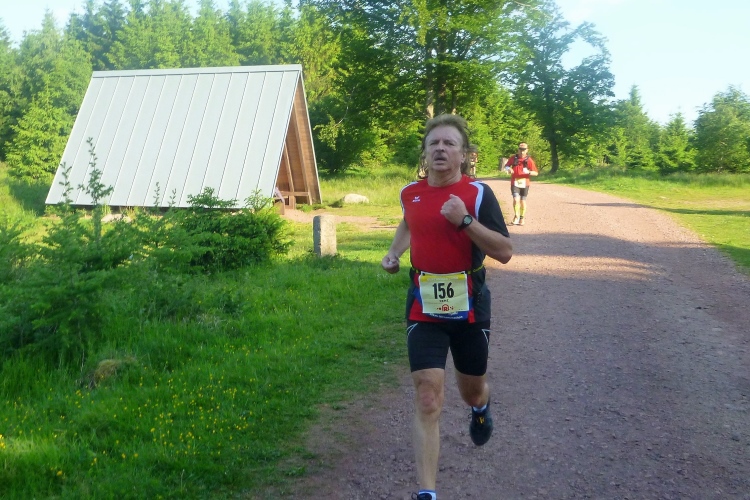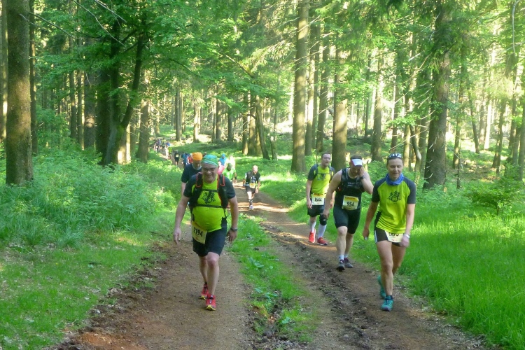Als erstmaliger Teilnehmer bin ich überrascht, wie schnell wir hier noch unterwegs sind. Meine Schätzung, dass wir in 10:40 h das Ziel erreichen, reduziert sich auf den letzten Kilometern immer mehr und am Ende werden es 10:08 h. Das 70-km-Schild macht schon richtig stolz. So lang war ich noch nie zu Fuß unterwegs. Eine Skipiste ist zu queren. Über einen schmalen Weg geht es nach Schmiedefeld. Die Party kann man schon hören. Eine Kuppe und dann noch dreihundert Meter auf das Ziel zu. Auf der linken Spur laufen die Marathonis ein.