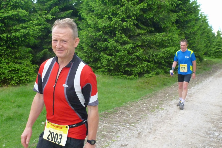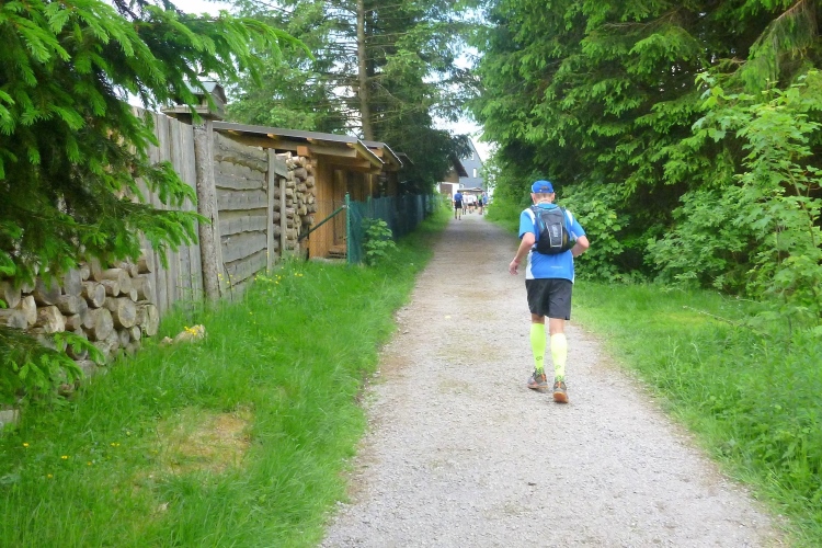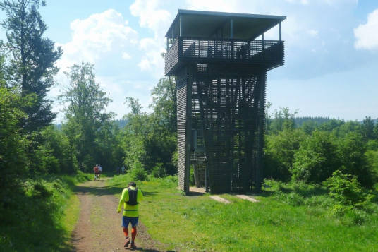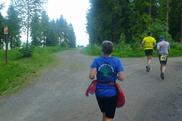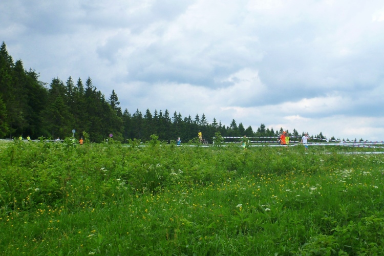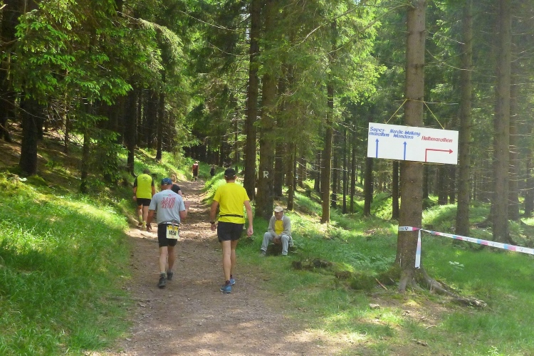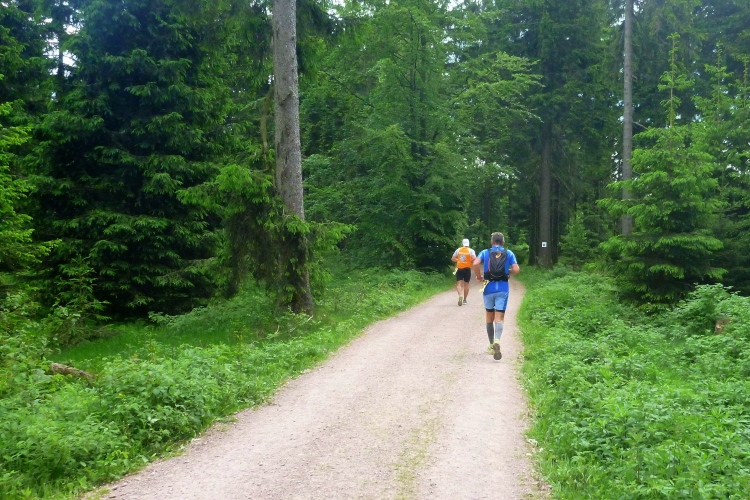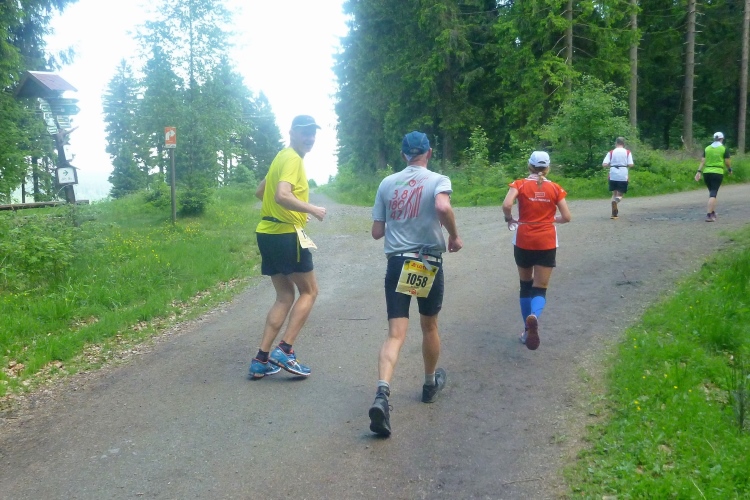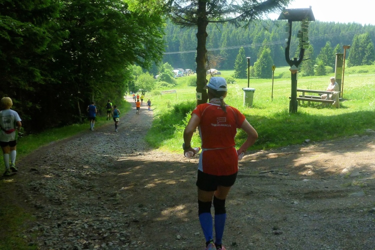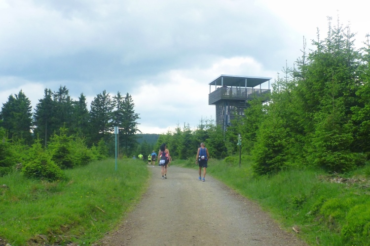 Wichtig erscheint es mir, auf den Charakter der Strecke hinzuweisen: Es geht durch den Nadelwald, erst mal 25 km tendenziell bergauf, oft mit Gehpausen nach oben und Laufeinlagen bergab, wenigstens für uns Flachlandtiroler. In dem riesigen Wander- und Mountainbikegebiet kann man auf den unzähligen Wegmarkierungen viele interessante Namen entdecken und oft auch Angaben zur jeweiligen Höhe über Normalnull. In den zahlreichen Unterständen kümmern sich meist Angehörige der Bergwacht um unser Wohlbefinden. Bis km 60 sind Ausblicke eher Mangelware. Eine Übersicht über die Umgebung verschaffen nur die immer mal wieder auftauchenden Aussichtstürme, wenn man die besteigt.