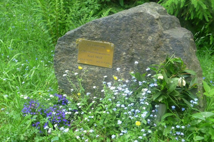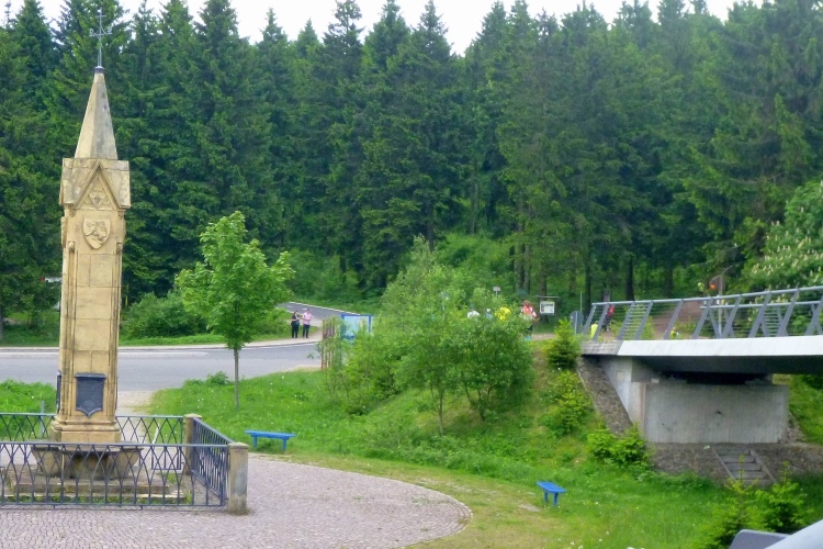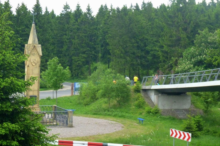 Über eine Brücke geht es auf die Landstraße 3247 mit Blick auf das Rondell, einen Obelisk, der an den Straßenbau von 1830 bis 1832 erinnert und der folgende Inschrift tragen soll:
