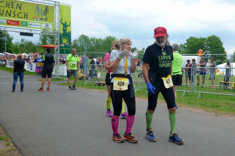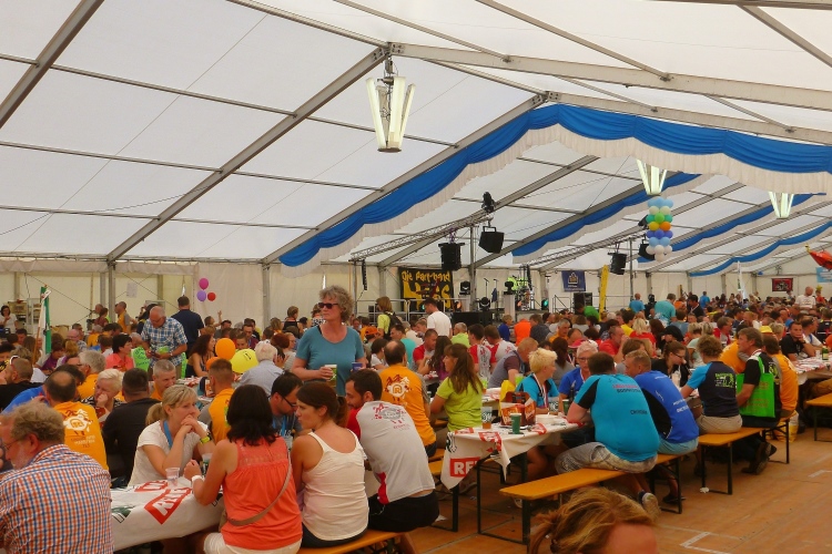 Die Zielorganisation ist perfekt: Es gibt genug Duschen mit warmem Wasser und große Umkleidezelte, Sauna, Finisher-Schwarzbier und Suppe, Urkundendruck und endlich, gleich neben der Krankenstation, die heute leider wetterbedingt gut ausgelastet ist, auch das lang ersehnte Finisher-Shirt.