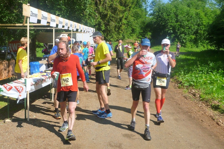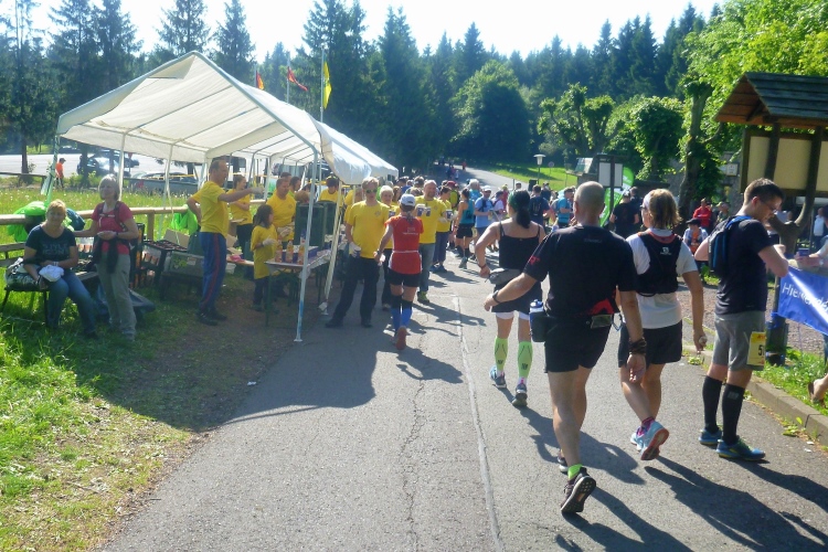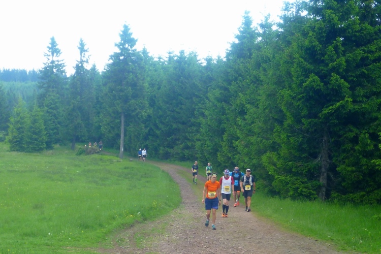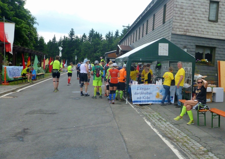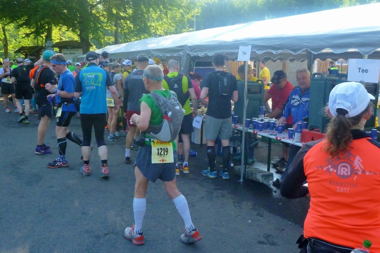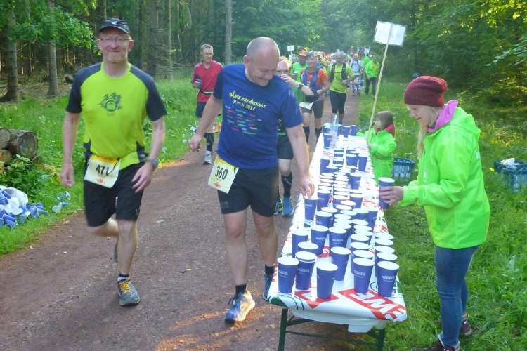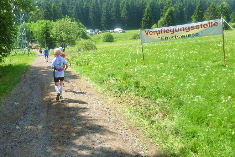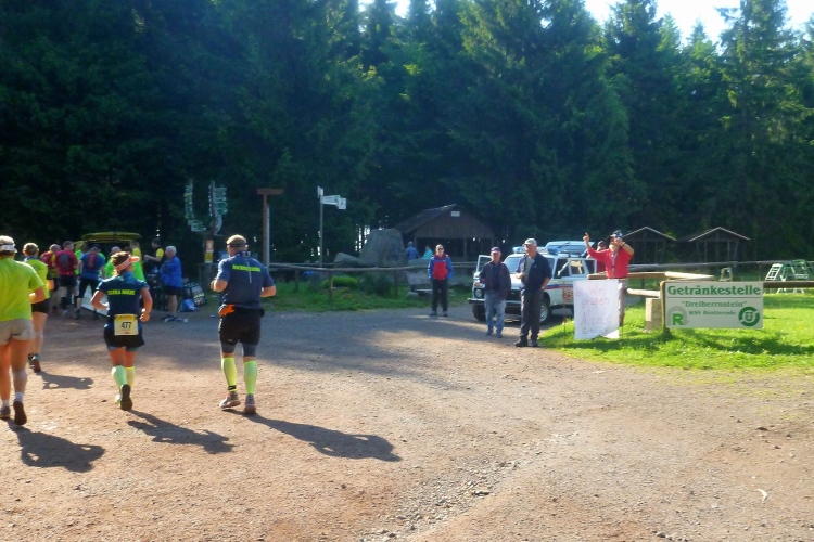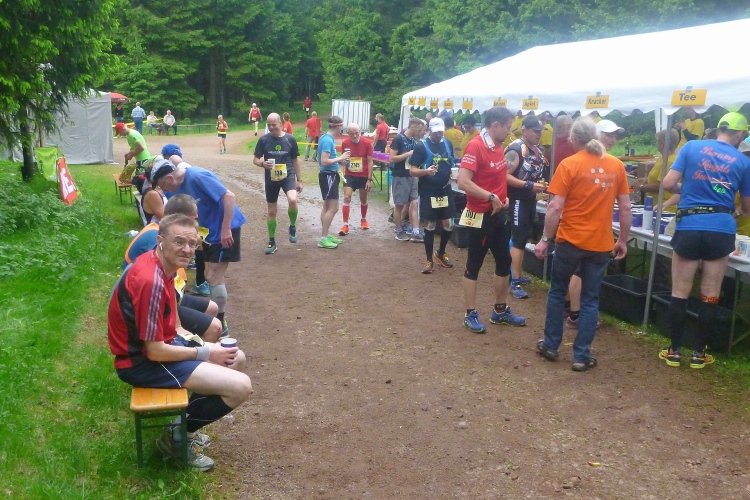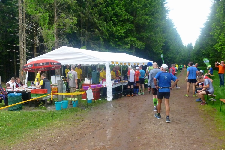 Endlich die große Verpflegungsstelle Schmücke. Die letzten sechs Kilometer kamen mir doch recht lang vor. Noch mal zugreifen, dann weiter. Ein Colagetränk liefert die versprochene Energie. Es geht fast 270 Höhenmeter auf breiten Wegen bergab. Laufen ist angesagt. Jeder kleine Gegenanstieg wird noch mal für eine kurze, erholende Gehpause genutzt.