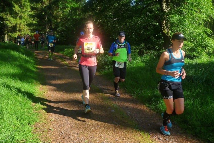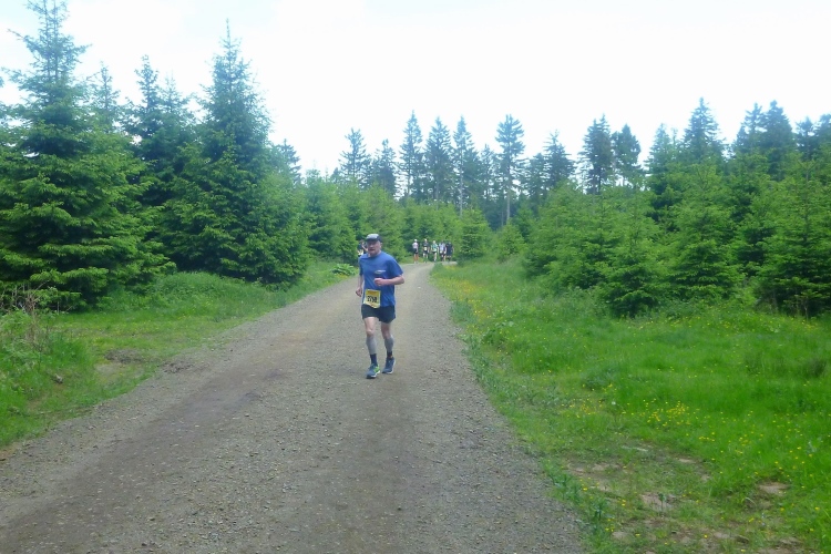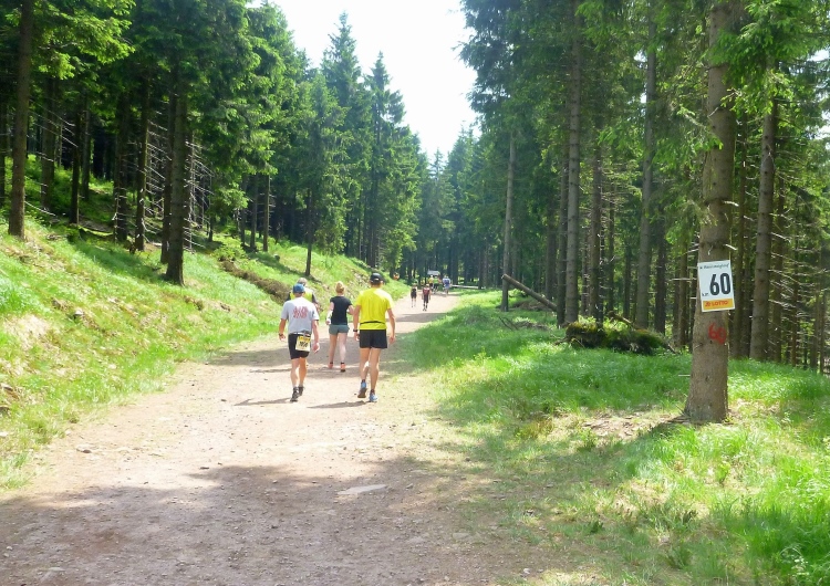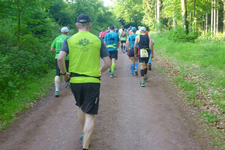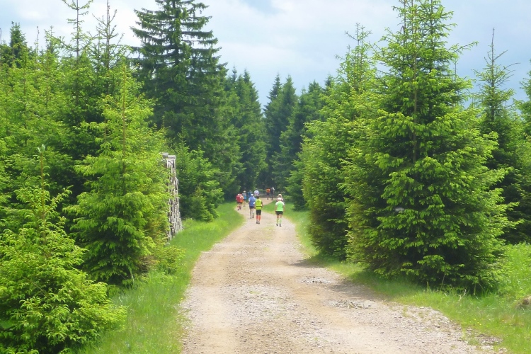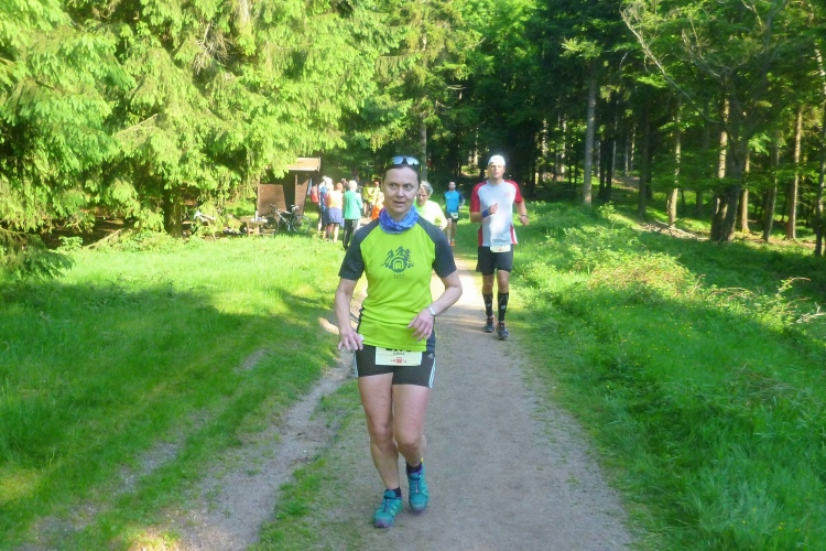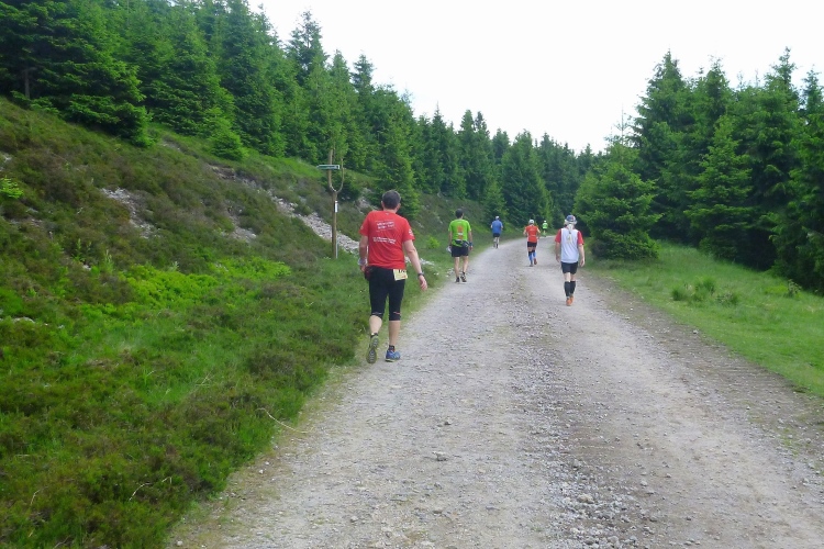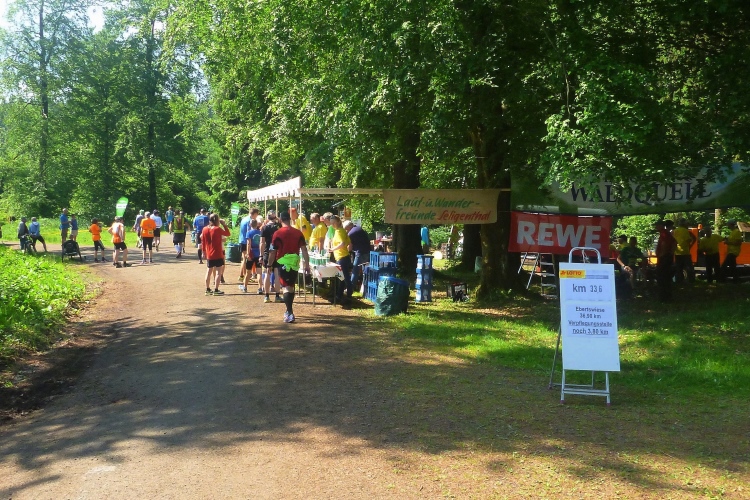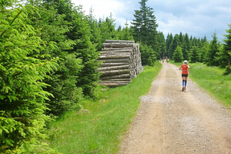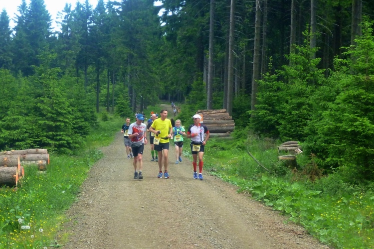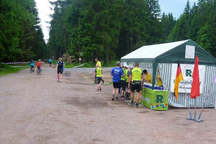 Endlich die große Verpflegungsstelle Schmücke. Die letzten sechs Kilometer kamen mir doch recht lang vor. Noch mal zugreifen, dann weiter. Ein Colagetränk liefert die versprochene Energie. Es geht fast 270 Höhenmeter auf breiten Wegen bergab. Laufen ist angesagt. Jeder kleine Gegenanstieg wird noch mal für eine kurze, erholende Gehpause genutzt.