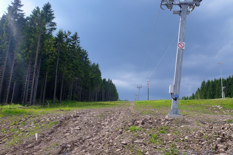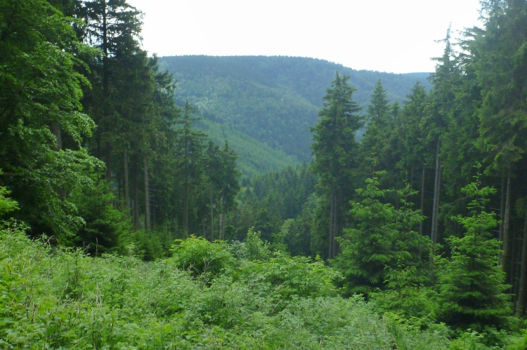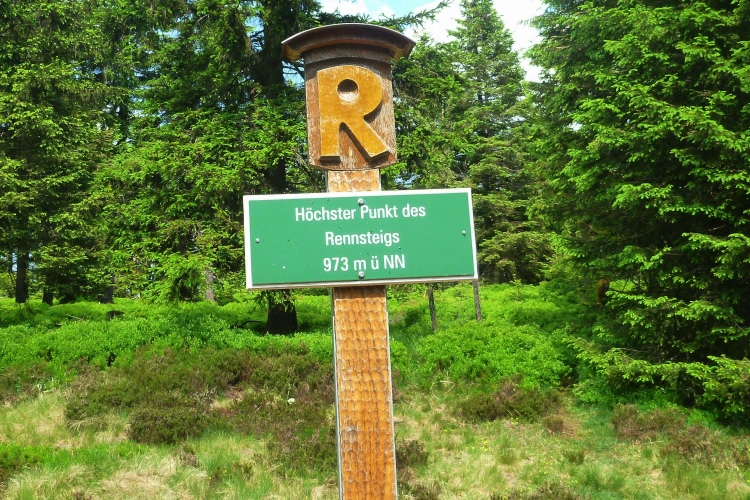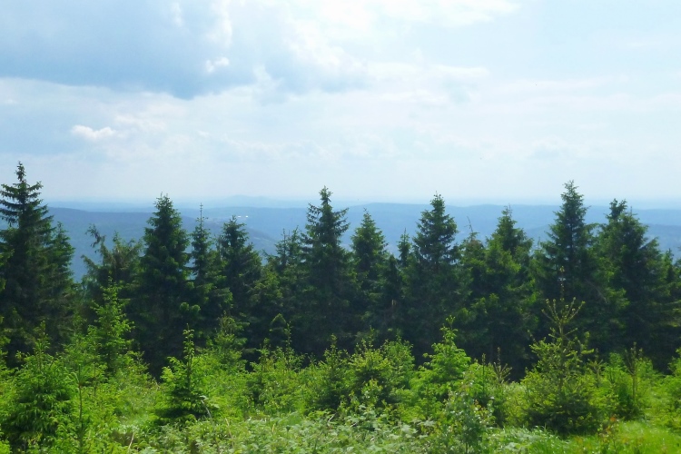Der große Beerberg bei km 61,1 ist mit 973 Metern der höchste Punkt der Strecke und des Thüringer Waldes. Das Ambiente ändert sich nun auffällig: Es wird hellgrün und oft hat man nun schöne Ausblicke auf die umliegenden Hügel. Richtig idyllisch.