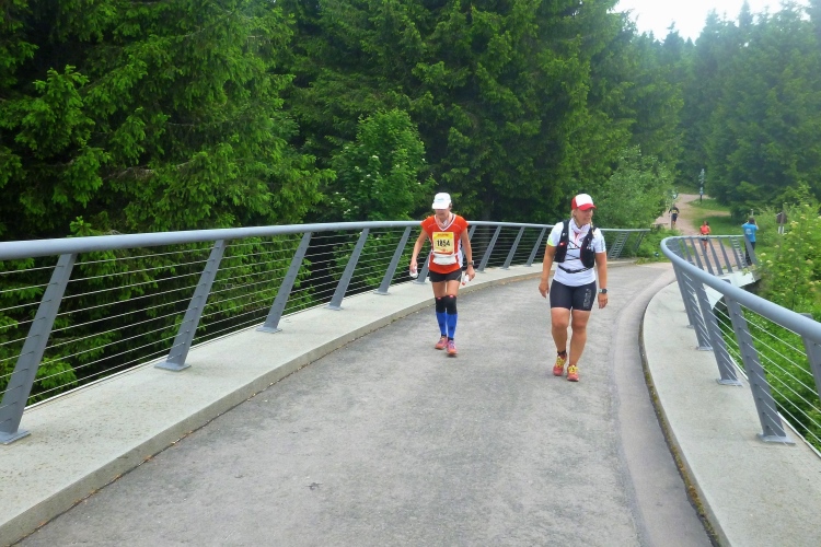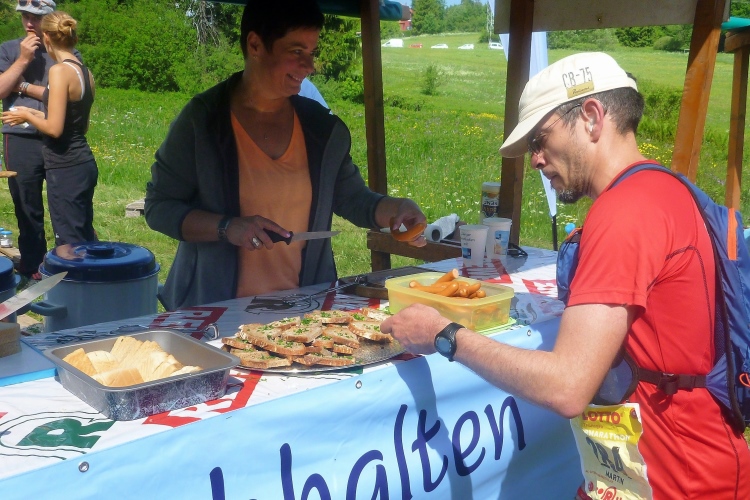 Wir werden als M4Y-Reporter begrüßt und erfahren, dass die Führenden schon vor dreieinhalb Stunden vorbei kamen. Judith und ich sind siebeneinhalb Stunden unterwegs, ganz zufrieden und haben nur noch lockere 20 Kilometer vor uns. Etwas stutzig werden wir, als uns der Ansager für die folgenden drei Kilometer viel Erfolg beim Anstieg wünscht. Aber so schlimm erscheint uns der später gar nicht.