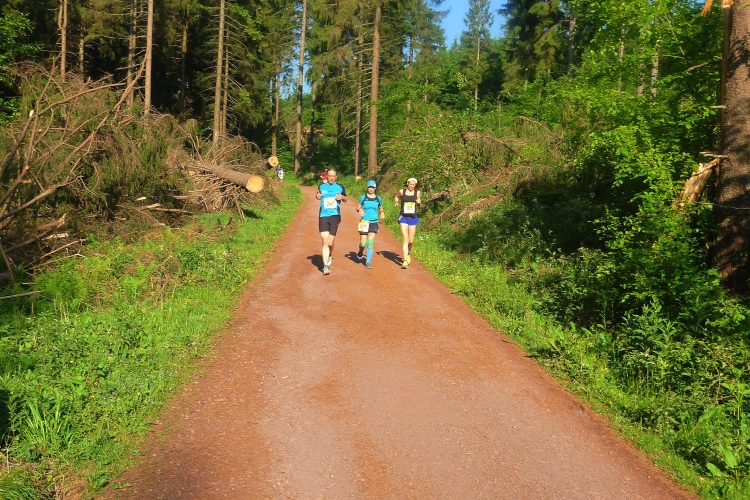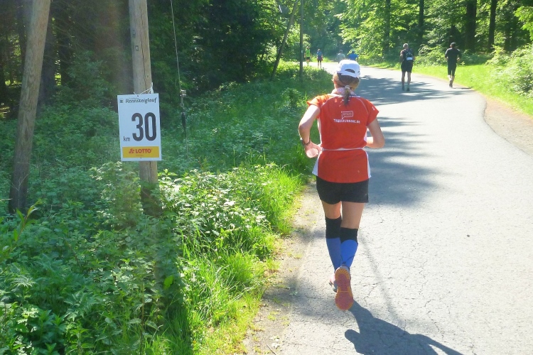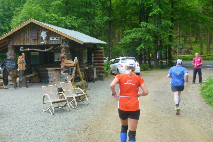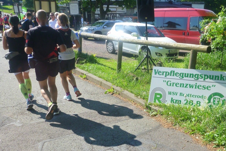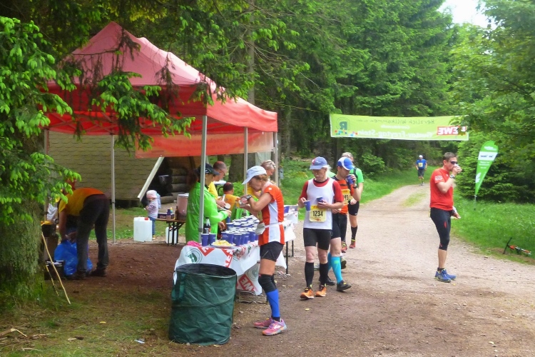 Km 18 bringt den dritten Verpflegungspunkt, erstmals mit dem „großen“ Programm: Besonders der Rennsteig-typische Haferschleim ist sehr beliebt und inzwischen auch in diversen fruchtigen Geschmacksrichtungen erhältlich. Die Versorgungsstellen liegen meist an den schmalen und kurvigen Straßen, die das riesige Gebiet durchziehen. Oft befinden sich nebenan Ausflugslokale.