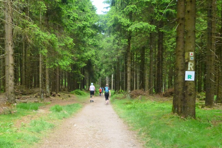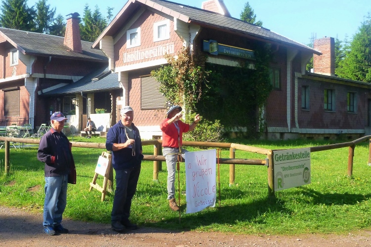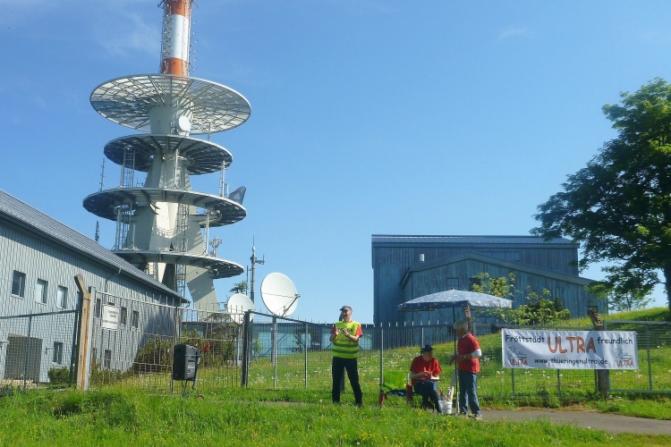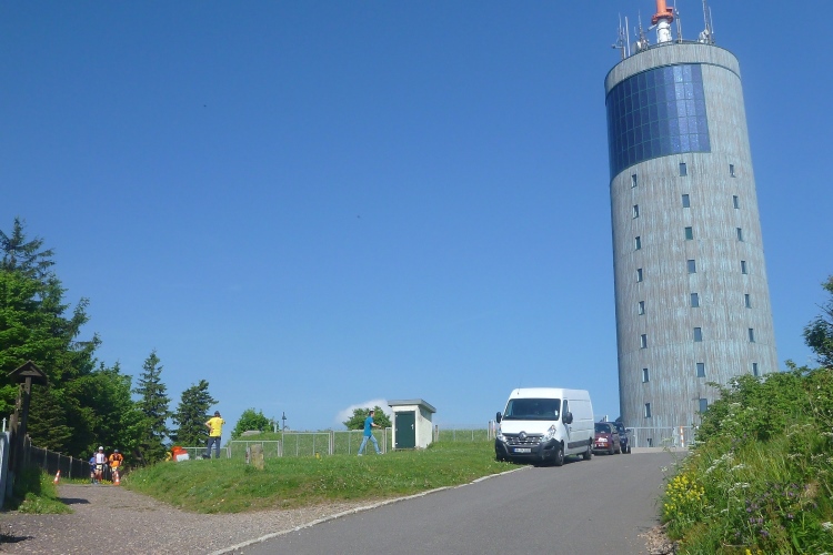 Noch mal ein steiler Anstieg. Wir kommen an einem markanten Felsen vorbei, dann sehen wir den Funkmast und gleich auch den neuen Aussichtsturm auf dem Großen Inselsberg, mit 916,5 hm eine wichtige Erhebung im Thüringer Wald. Laute Musik erwartet uns. Der Rennsteig bildete hier früher die Grenze zwischen Sachsen-Gotha und Hessen. Deshalb gibt es noch heute auf „beiden Seiten“ einen Berggasthof, „Stöhr“ heißt er auf der hessischen, „Stadt Gotha“ auf der gothaischen Seite. Der Funkverkehr war zu DDR-Zeiten unverschlüsselt und wurde fleißig vom Bundesnachrichtendienst abgehört. Jetzt geht es steil bergab, um 200 Höhenmeter, die auf 1,3 km verteilt sind. Erst über Treppen, dann auf Teer. Sicher bei Regen eine gefährliche Rutschpartie. Viel Anfeuerung durch Spaziergänger, die in die Gegenrichtung unterwegs sind. Am Parkplatz Grenzwiese dann ein Funpark für Kinder und endlich etwas zu trinken.