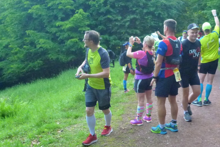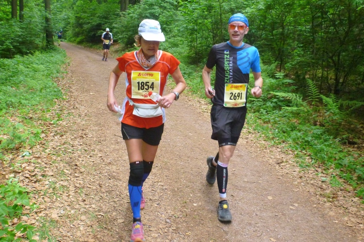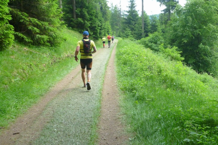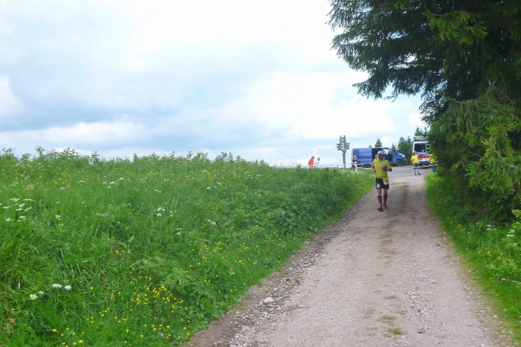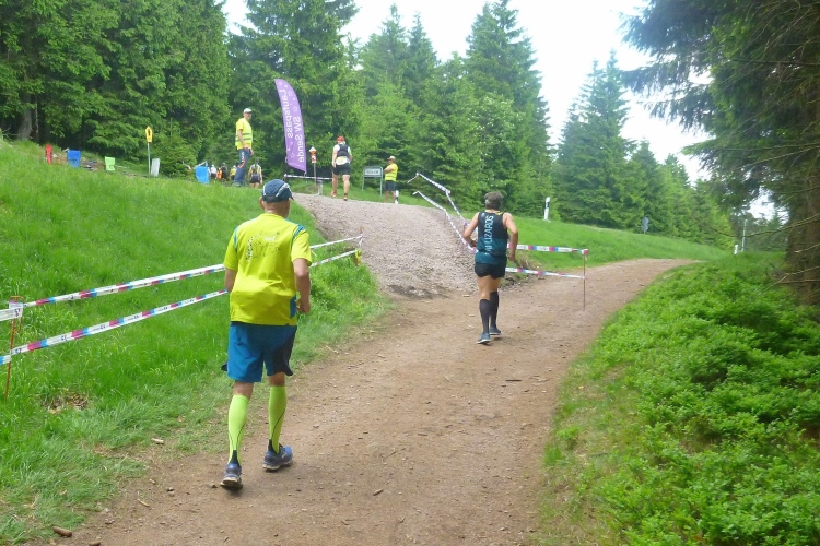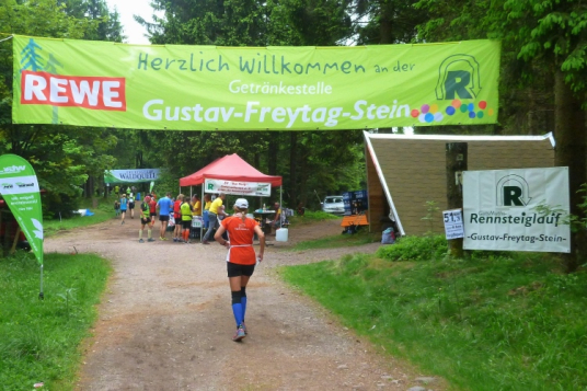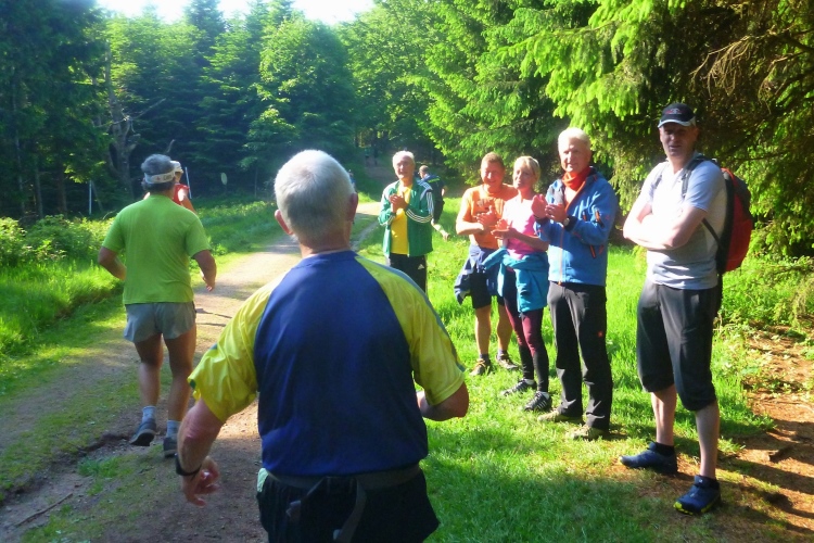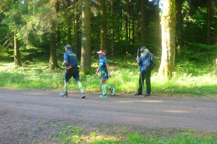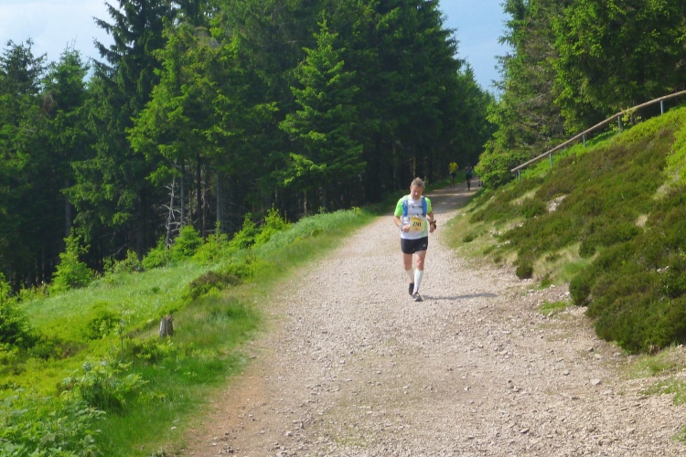 Wir müssen weiter nach oben. Hier gibt es das einzige kurze Stück auf einem Wurzelweg, dem leider ein Schweizer Läufer vor uns zum Opfer fällt. Aber er hat sich nicht verletzt und schon geht es weiter. Kurz vor der nächsten Getränkestelle steht ein älterer Herr mit langem weißen Bart. Das Paar vor mir bittet um eine Fotoerlaubnis. Auf Nachfrage beim Fotografen erfahre ich, dass es sich um den personifizierten „Rennsteig“ gehandelt hat, der heute hier zusieht.