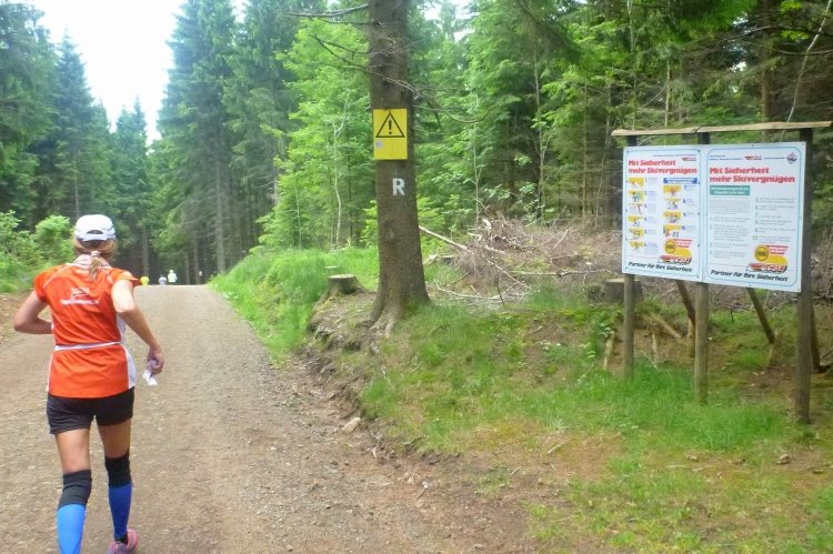 Viele Schilder weisen hier oben auf Gefahren des Skisports hin. Also ist die Sache mit dem Winter nicht ganz von der Hand zu weisen. Die Gustav-Freytag-Stein-Verpflegungsstelle bei km 51,3 erwähne ich, weil wir bei km 5,13 unserer Münchner Trainingsstrecke immer die Gustav-Freytag-Straße passieren. Und da fällt mir auf, dass ich die Marathonmarke übersehen habe. Aber das Ziel liegt ja diesmal noch in weiter Ferne.