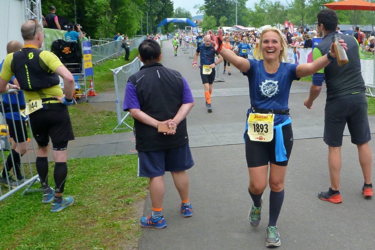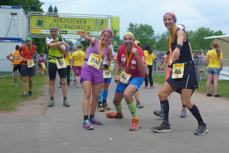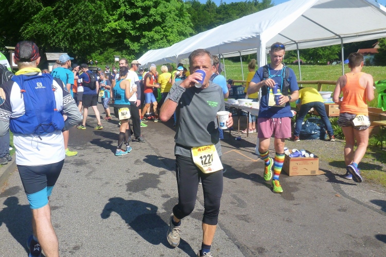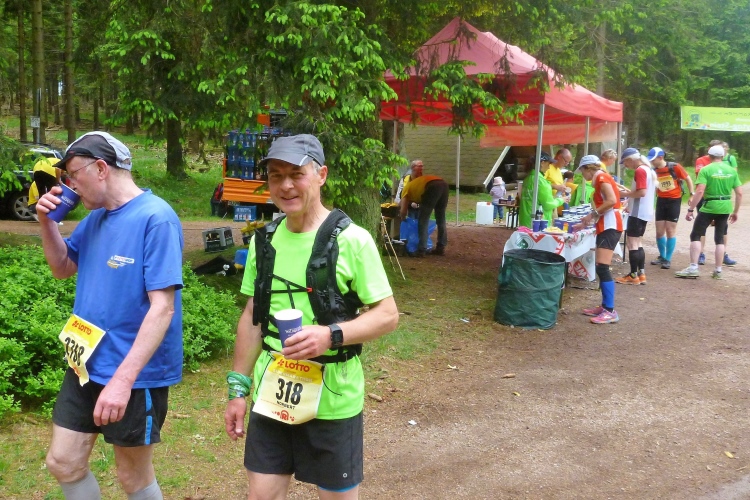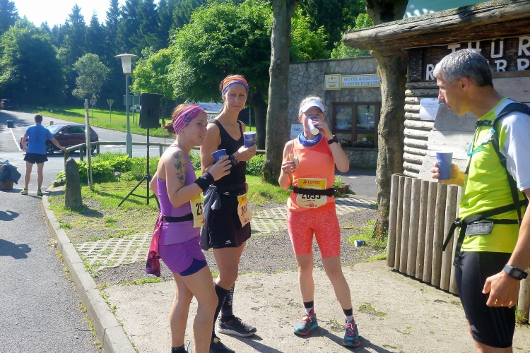 Am Getränkestand warten wir auf bekannte Gesichter. Judith, die andere, trifft mit strahlender Miene ein. So muss es sein. Und dann auch noch Rene mit seiner hauptsächlich weiblichen Laufgruppe. So happy kenne ich ihn auch vom Hartfüssler-Trail.