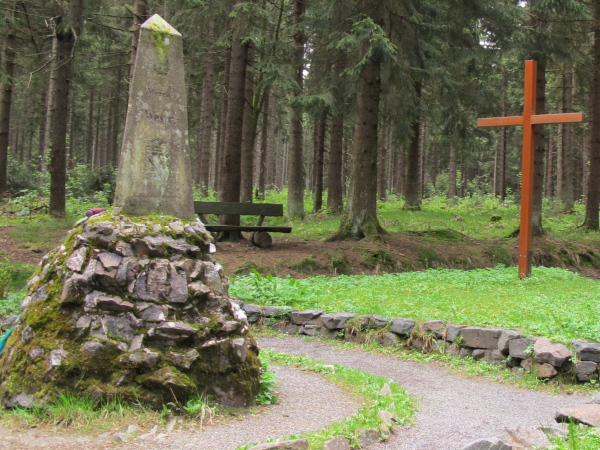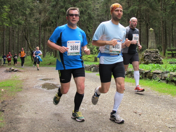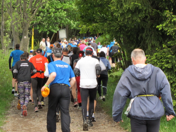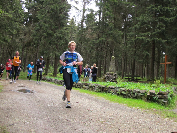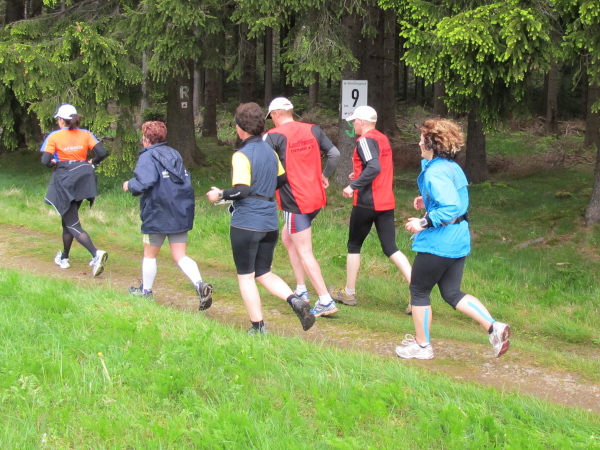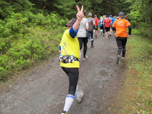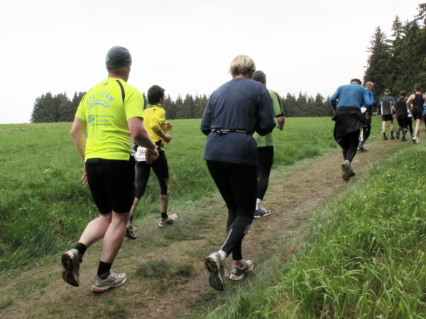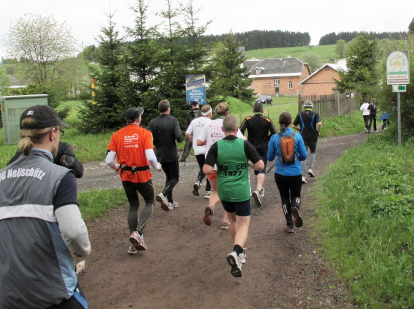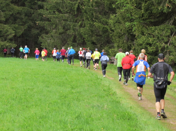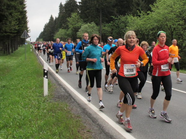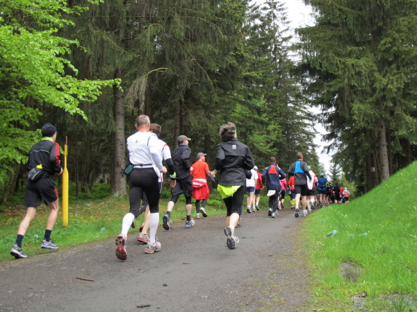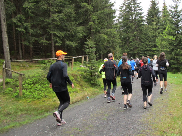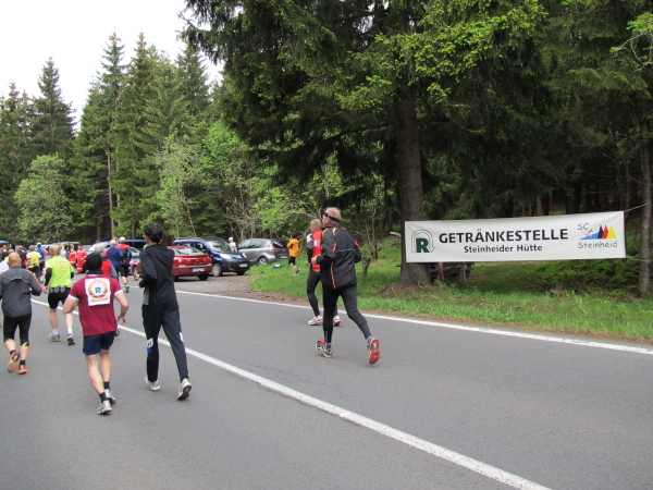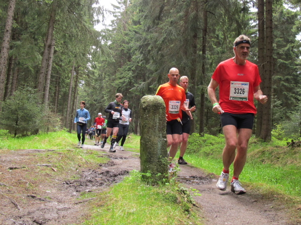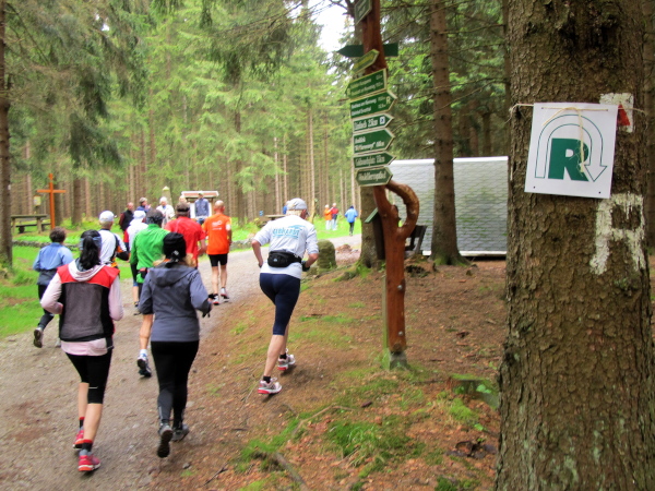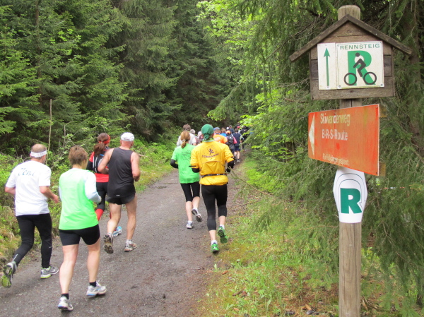 So, inzwischen haben wir uns auf der bequemen Verkehrsstraße warm- und freigelaufen. Das Feld hat sich sortiert und soweit auseinander gezogen, dass man bei der Steinheider Hütte (km 6) nach ausgiebiger Getränkeaufnahme auf den Rennsteig einbiegen kann.