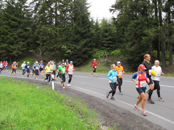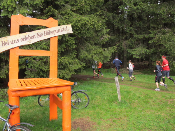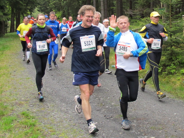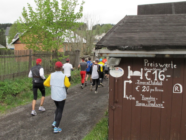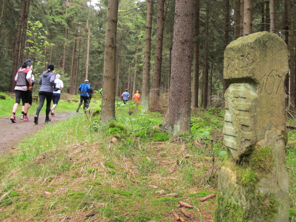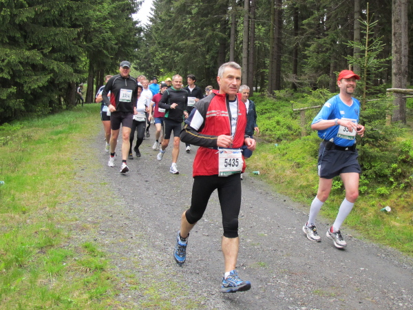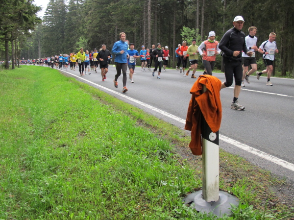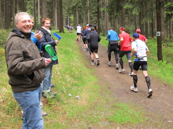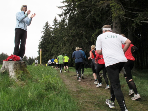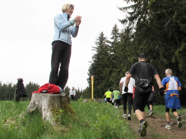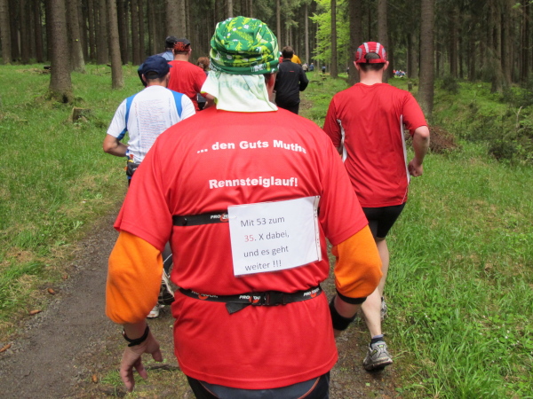 Viele Veranstalter geben für eine 10malige Teilnahme Privilegien oder besondere Auszeichnungen aus. Beim Rennsteiglauf muss man 25 erfolgreiche Teilnahmen nachweisen, um in die Liste mit der Überschrift „Dem Rennsteig die Treue“ zu kommen. Trotzdem sind dort vor diesem Lauf 763 Namen verzeichnet. In Worten: Siebenhundertdreiundsechzig! Ich behaupte: Das ist einmalig, das ist Weltrekord. Spitzenreiter ist übrigens Hans-Georg Kremer, Initiator und Mitbegründer. Er war bisher jedes Jahr auf irgendeiner Strecke dabei. Aber auch was dahinter kommt, ist sensationell: 52 Läufer/innen haben mind. 35 Teilnahmen und 258 (!) mind. 30 Teilnahmen. Einer von ihnen läuft vor mir. Ein Zettel auf dem Rücken weist ihn als 53jährig aus. Er ist zum 35. Mal dabei und meint: „Es geht weiter!!!“. Später begegne ich einer Familie, die mit Kind und Kegel auf zusammen über 60 Teilnahmen kommt. Rennsteig pur.