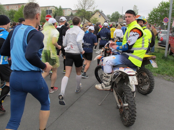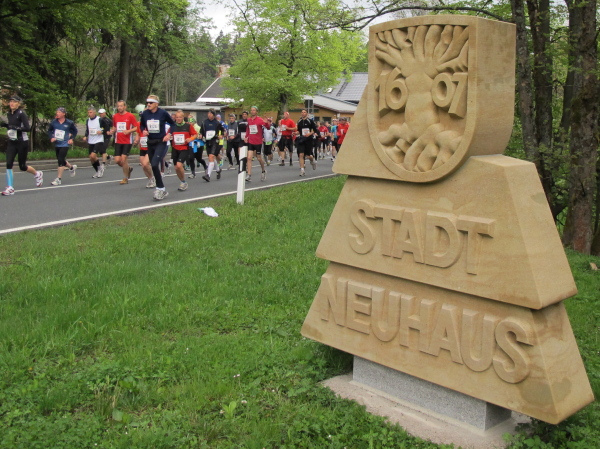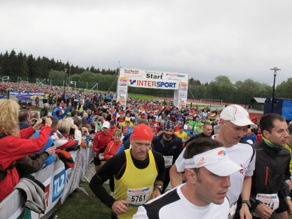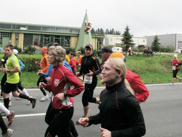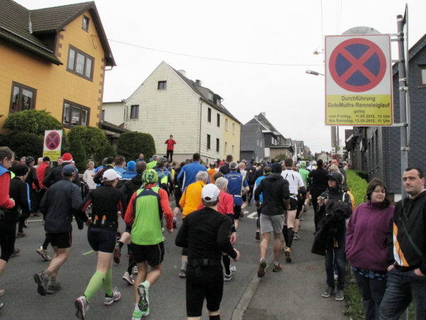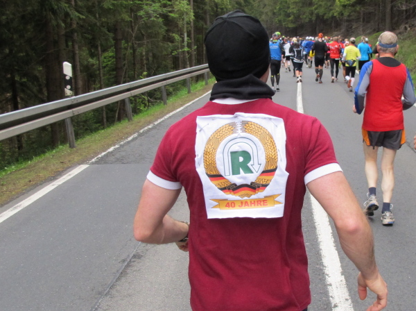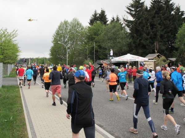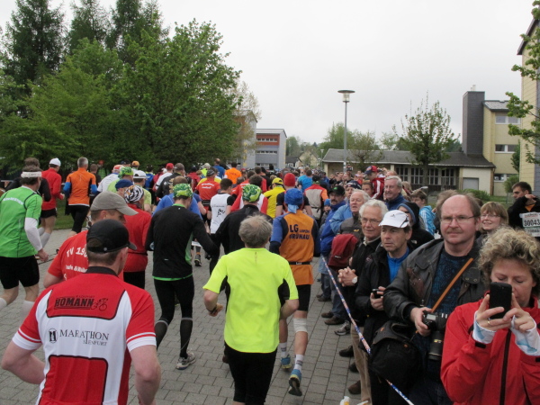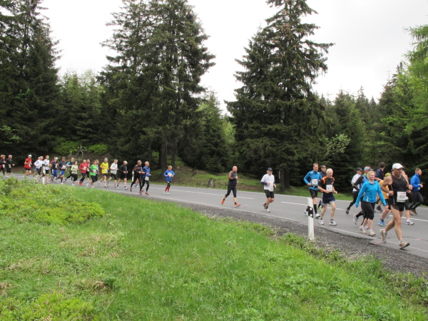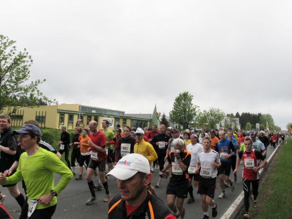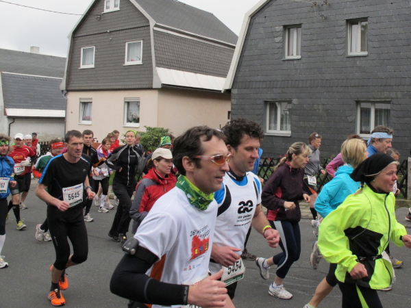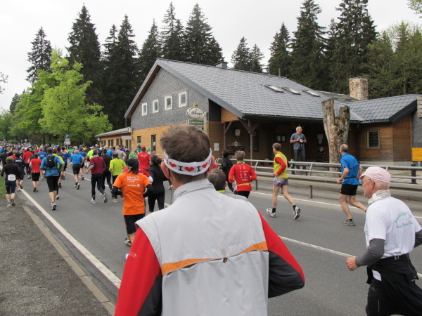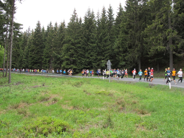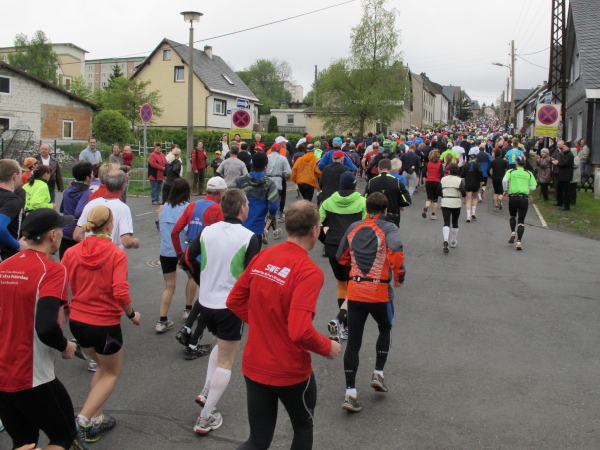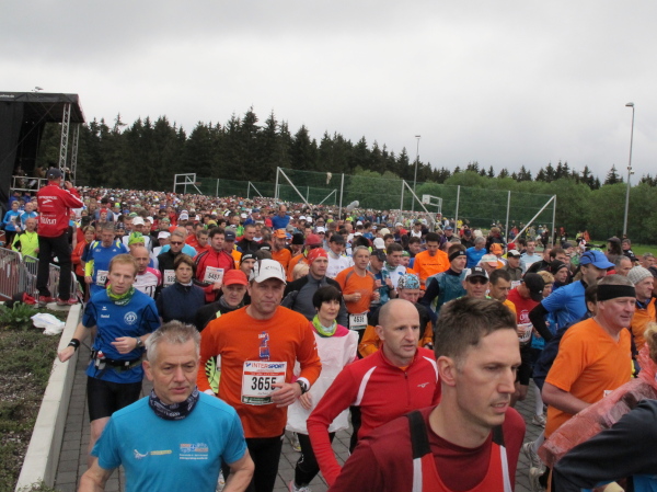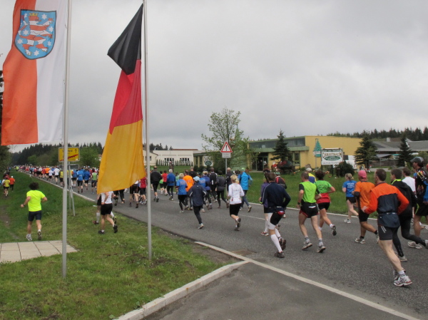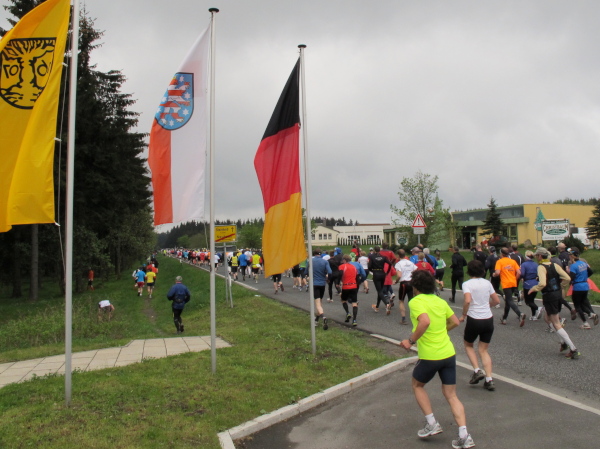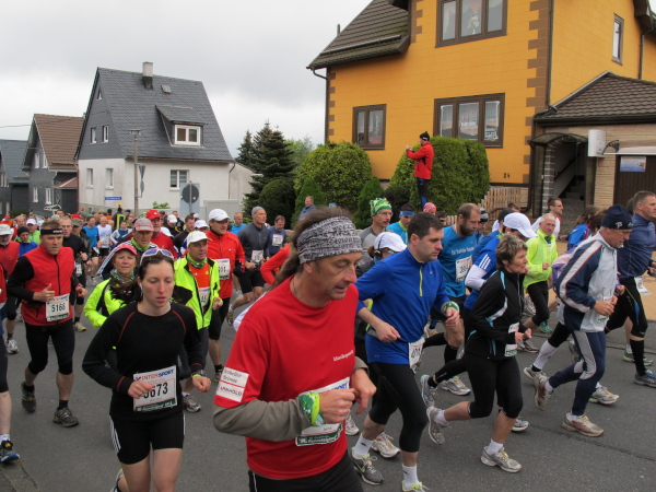 Wie gedopt rennt das Feld am tiefsten Punkt des Ortes durch das Spalier der vielen Zuschauer los. Die Pulsmesser piepsen und signalisieren neue Höchstwerte. Ist man endlich oben auf der Bundesstraße in Richtung Eisfeld, muss so mancher erst mal wieder runterkommen. Rätselhaft, warum man nicht hier startet. Man würde die Steigung sparen und der Marathon hätte die übliche Länge. Rätselhaft auch, weshalb man seinerzeit vor 36 Jahren, als man die „Kurzdistanz“ (zu Anfang 45 km) einführte, nicht einfach einen Startplatz auf der „normalen“ Strecke suchte, sondern einen ganz separaten Kurs mit Start in entgegengesetzter Richtung. Beim Rennsteiglauf ist halt vieles anders - und bleibt anders. So ist das Versprechen von Marcus, "es wird nichts geändert", zu verstehen. Damit der Lauf ein besonderer bleibt.