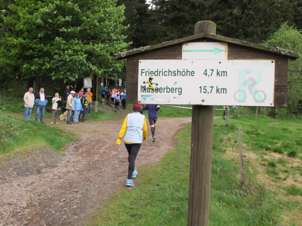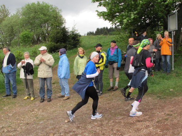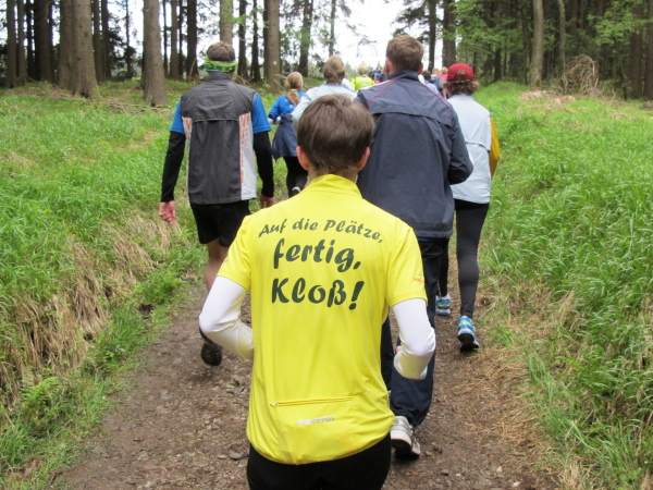 Einige Anstiege sind ziemlich steil, lang sind sie nicht. Beim ersten dieser Kategorie, bei Limbach (km 8), schalte ich ohne zu Zögern auf Gehschritt um. Am Ende der Steigung steht auf einem Baumstumpf eine blonde Frau. Ich habe sie schon einmal gesehen. Vor zwei Jahren, an gleicher Stelle. „Noch hier oder schon wieder?“, frage ich. Sie lacht: „Wie Du!“