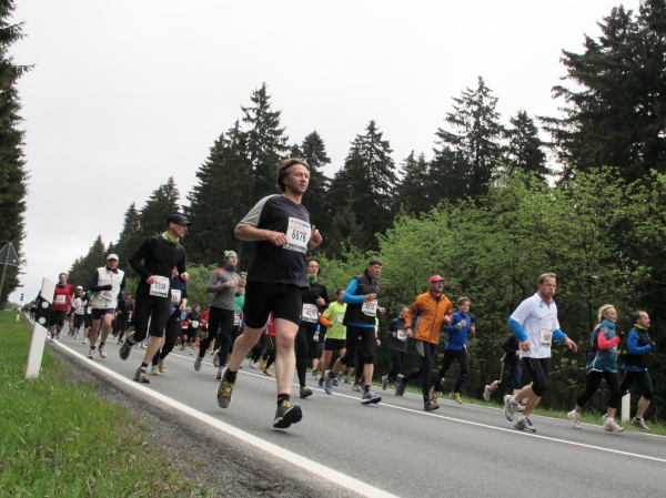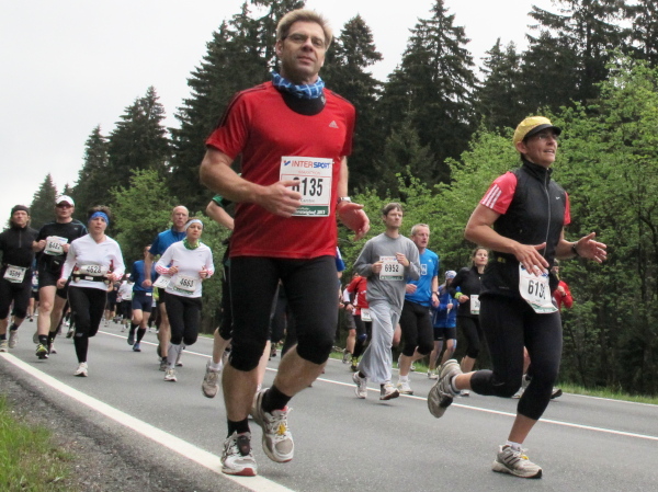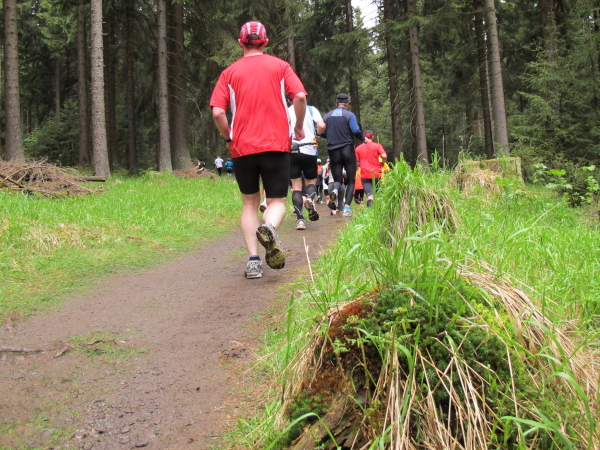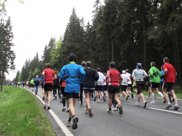 Der dunkle Tannenwald verschluckt die Läufer. Thüringer Waldluft - die Städter atmen durch. Die nächsten Kilometer sind repräsentativ für die gesamte Strecke. Mal geht es rauf, mal runter, mal sind die Wege breit, mal sind sie schmal. Nur flach sind sie selten. Die Anstiege addieren sich auf 637 m, abwärts geht es 706 m. Ein Bergmarathon hat andere Dimensionen, eine „schnelle“ Strecke auch.