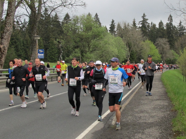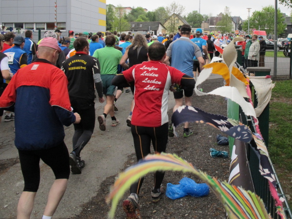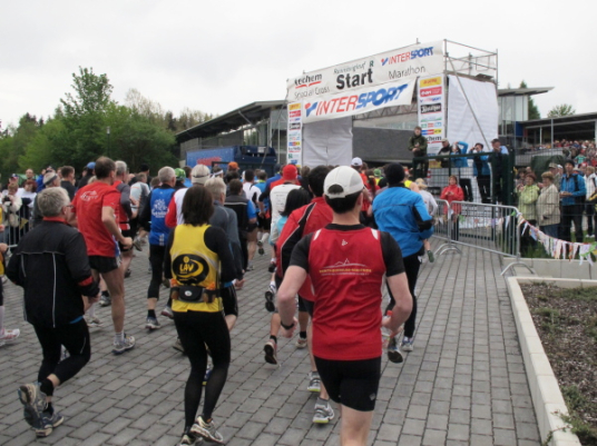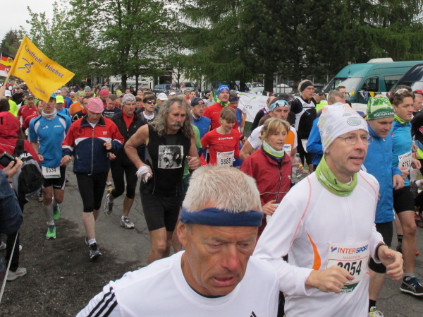 Ich garantiere Euch: Zu „Keep on running“ oder so was könnte der Starter sein ganzes Magazin verballern. Keiner würde loslaufen. Aber nach dem Schneewalzer, da geht’s zur Sache. Und ich garantiere Euch als weiteres: Jede und jeder (wieder außer mir), die/der hier startet, könnte auch 72 km laufen. Sie und er wollen es nur nicht. Und jetzt weiß jeder, warum.