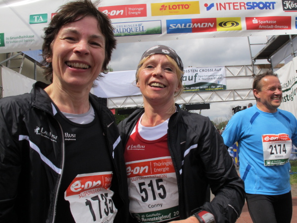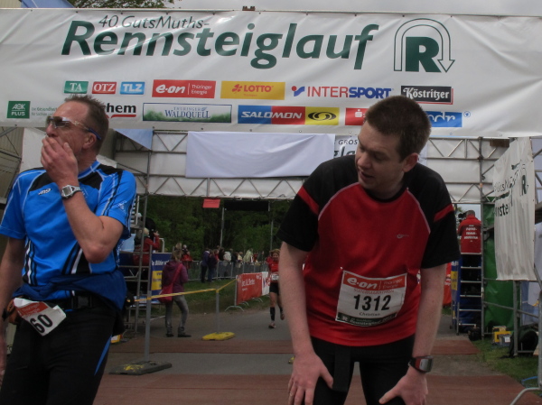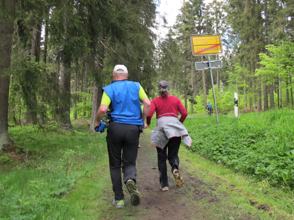Im Zelt wollte ich bei dem Sportausstatter was zum Anziehen kaufen. Der packte aber gerade zusammen, weil der Platz für die Abschlussfeier gebraucht wurde. Also ans Auto. Als wir (meine Frau und ich) hinunter in den Ort kamen, behauptete sie zuerst, das Auto irgendwo die Straße runter und dann rechts geparkt zu haben. Als wir es nicht fanden, meinte sie, sie hätte es vielleicht doch dort, sie zeigte jetzt in die entgegengesetzte Richtung, geparkt. Das ging so eine Stunde, ungelogen. Dann fiel ihr ein, dass in der Nähe ihres Parkplatzes ein Schild zum Rennsteiglauf-Büro war. Also fragten wir einen Polizisten, wo das Rennsteiglauf-Büro ist. Der wusste das. 50 m davor stand das Auto.