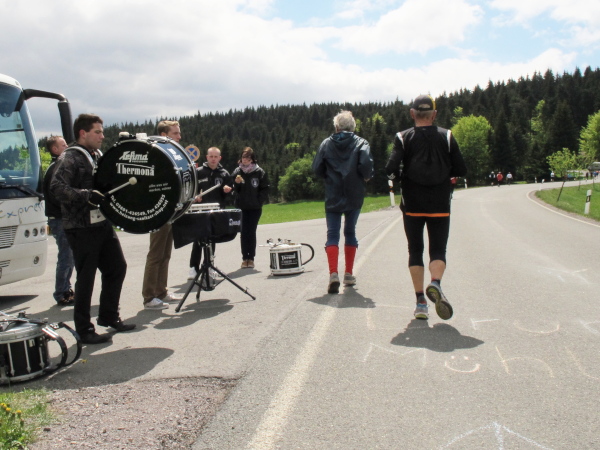 An Tagen wie diesem ist man sich aber einig, man feiert die Rennsteigläufer mit zünftiger Blasmusik und deftiger Verpflegung. Wem’s in den Waden zwickt, bekommt eine Massage. Weiter geht’s. Ein Kamerad ist offensichtlich nicht gut beieinander. Gerade denke ich noch, dass es eng werden wird für ihn und will ihn fragen, ob ich ihm helfen kann. Da höre ich, wie er in sein Handy spricht: „Hallo, ich bin gerade bei km 30! Ja, mir geht es gut, sehr gut. Ich komme!“ Sind schon harte Hund, die Rennsteigläufer.