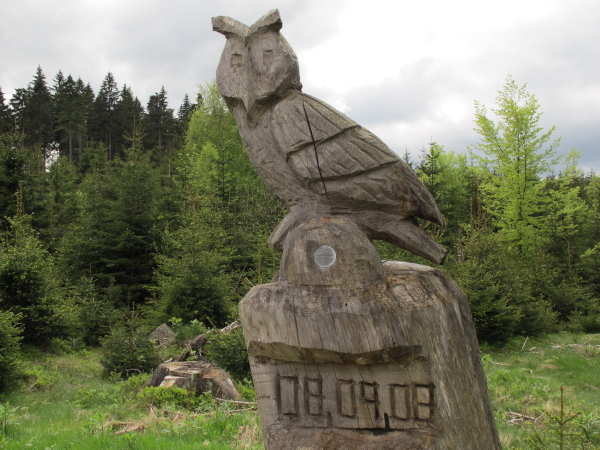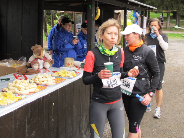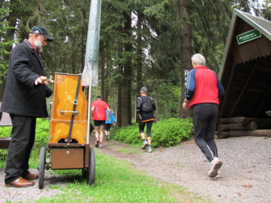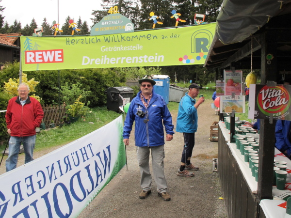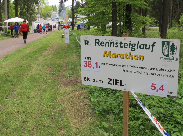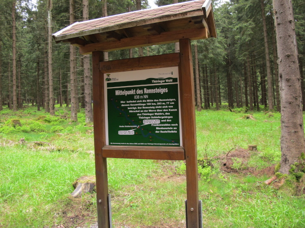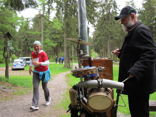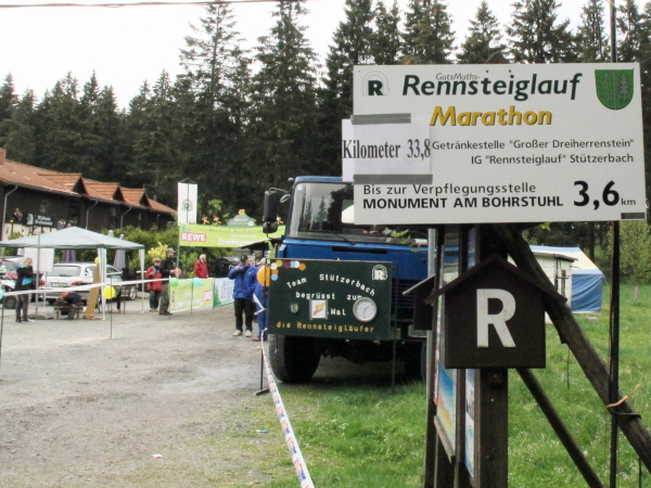 Über ein ziemlich windiges Hochplateau laufen wir weiter. Gegenüber der kleinen Schutzhütte an der alten Landesgrenze steht wie eh und je der Mann mit der Rennsteigmütze, konzentriert gleichzeitig Drehorgel und Schlagzeug spielend. Wenig später weist uns ein Schild darauf hin, dass wir uns genau in der Mitte des 169 km, 293 m und 77 cm langen Rennsteiges auf 838 m Höhe befinden. Gut zu wissen. Die für uns wichtigere Information bekommen wir kurz darauf bei der Verpflegungsstelle Großer Dreiherrenstein: 33,8 km liegen hinter uns, nur noch 9,7 km vor uns.