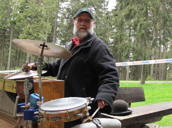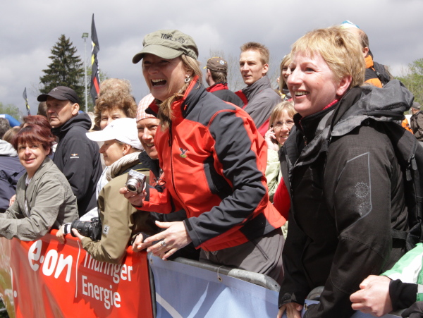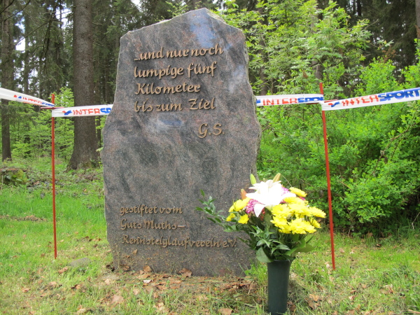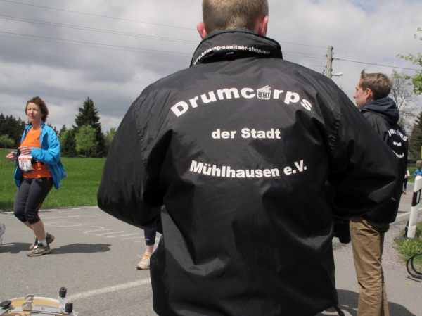 Bei der kleinen Siedlung mit dem merkwürdigen Namen Allzunah begrüßt uns das Drumcorps der Stadt Mühlhausen. Gut gemacht, Freunde, danke. Etwas Schwung tut gut, denn es gibt noch einen giftigen Anstieg, für den man aber mit Köstritzer, all you can drink, belohnt wird. „Nur noch lumpige fünf Kilometer bis zum Ziel“ steht auf einem Gedenkstein, der bestimmt auch einmal historische Bedeutung haben wird. Zur Feier des Tages ist er mit Blumen geschmückt.